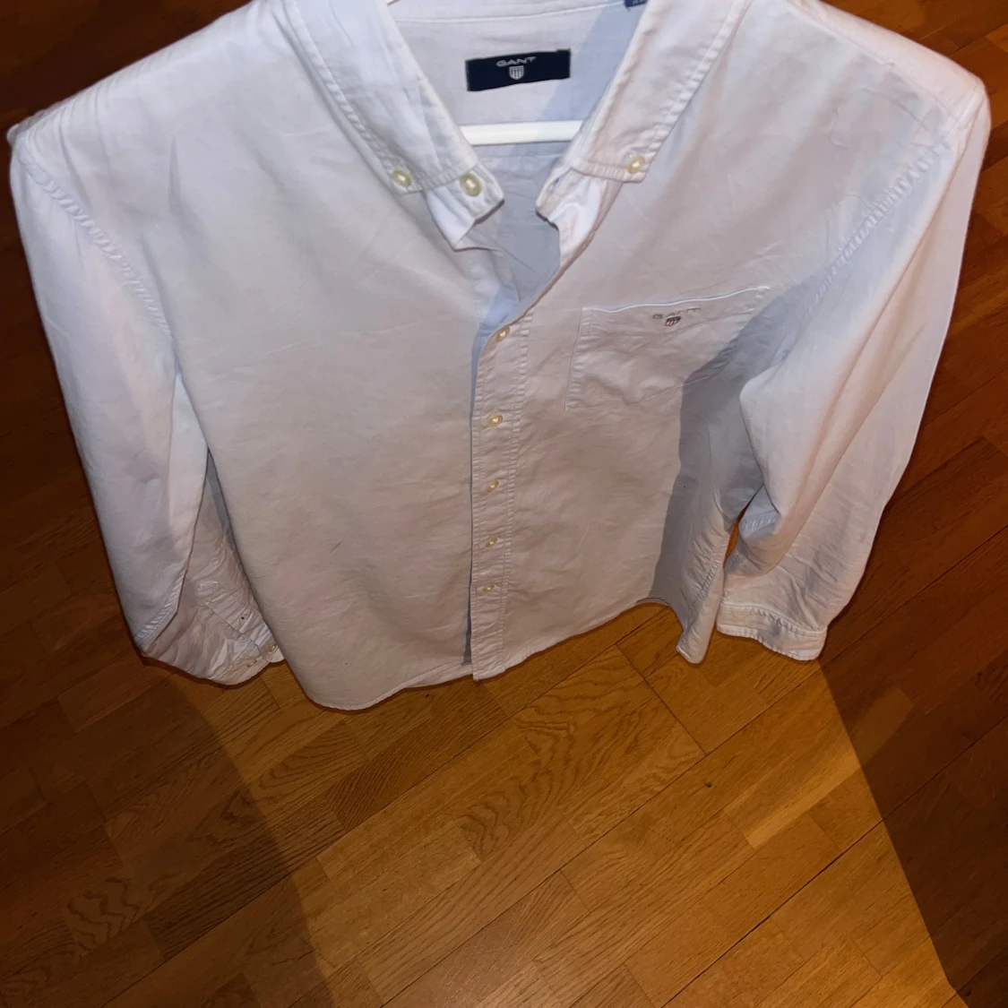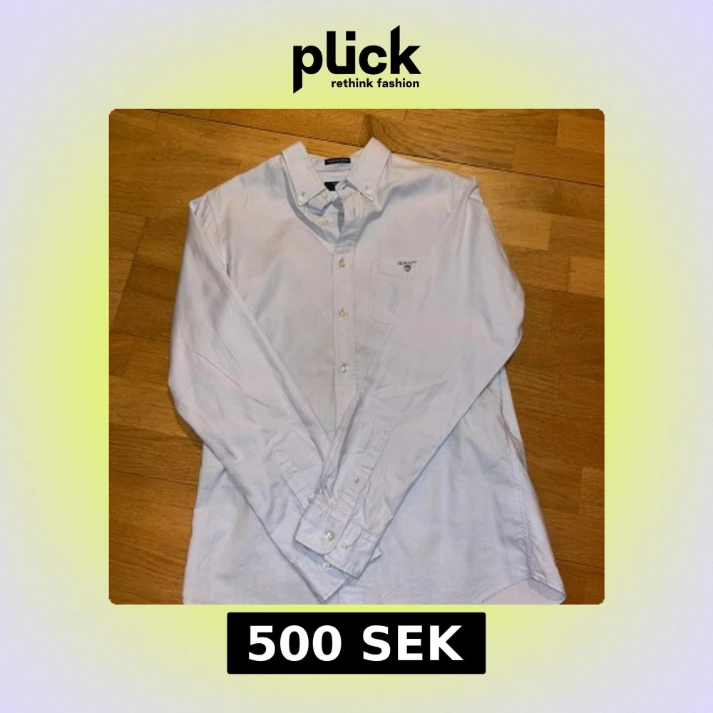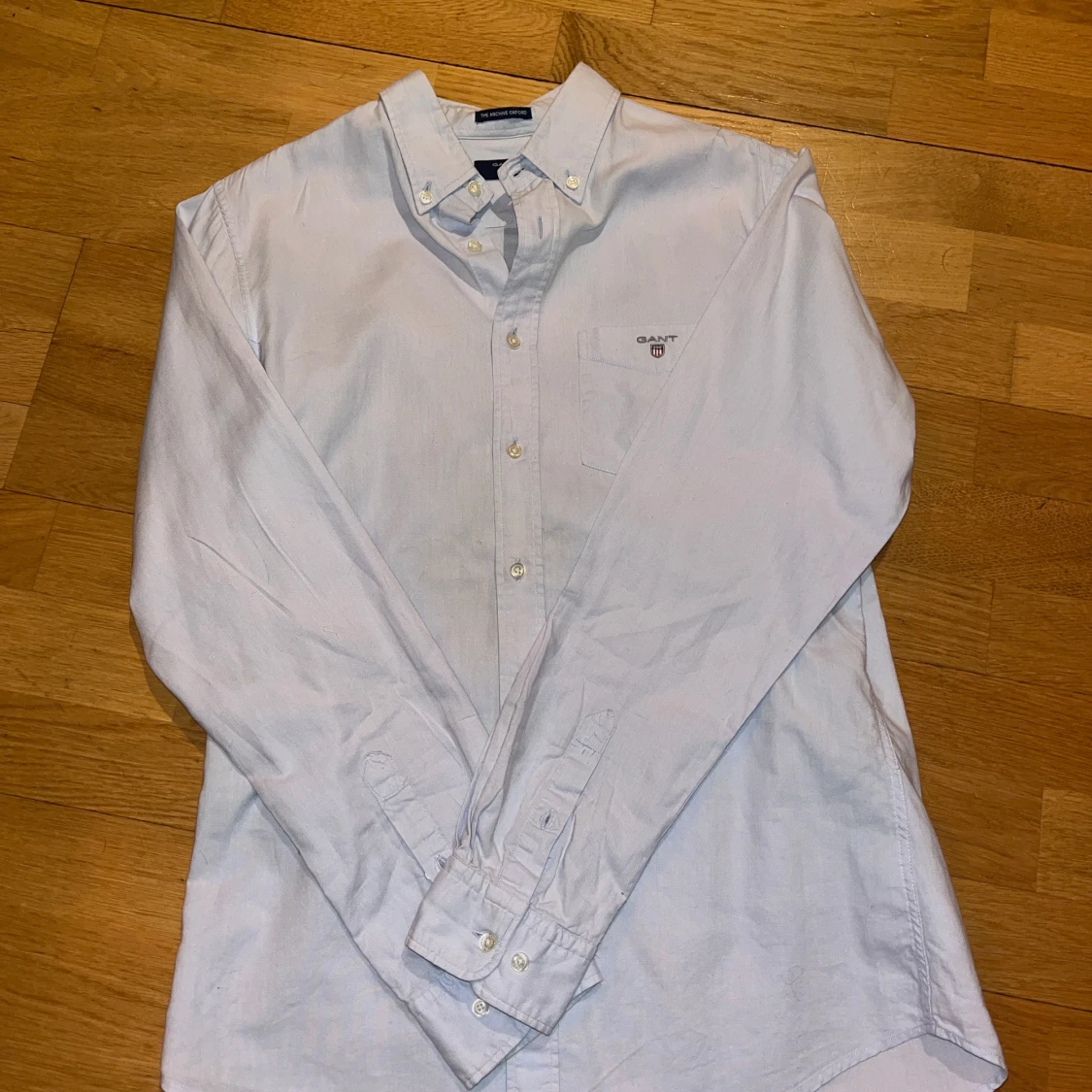 Säljer en klassisk blå långärmad oxford-skjorta från Gant. Skjortan har en broderad logga på bröstfickan och knappar framtill. Perfekt för en stilren look. Skjortan är storlek S och i bra skick