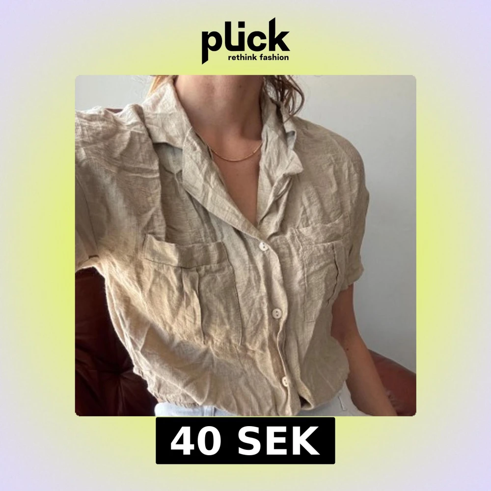 Snygg beige skjorta med korta ärmar och två stora bröstfickor. Skjortan har avslappnad passform, knappar framtill och en lite croppad, elastisk nederkant. Behövs strykas men är annars i fint skick!