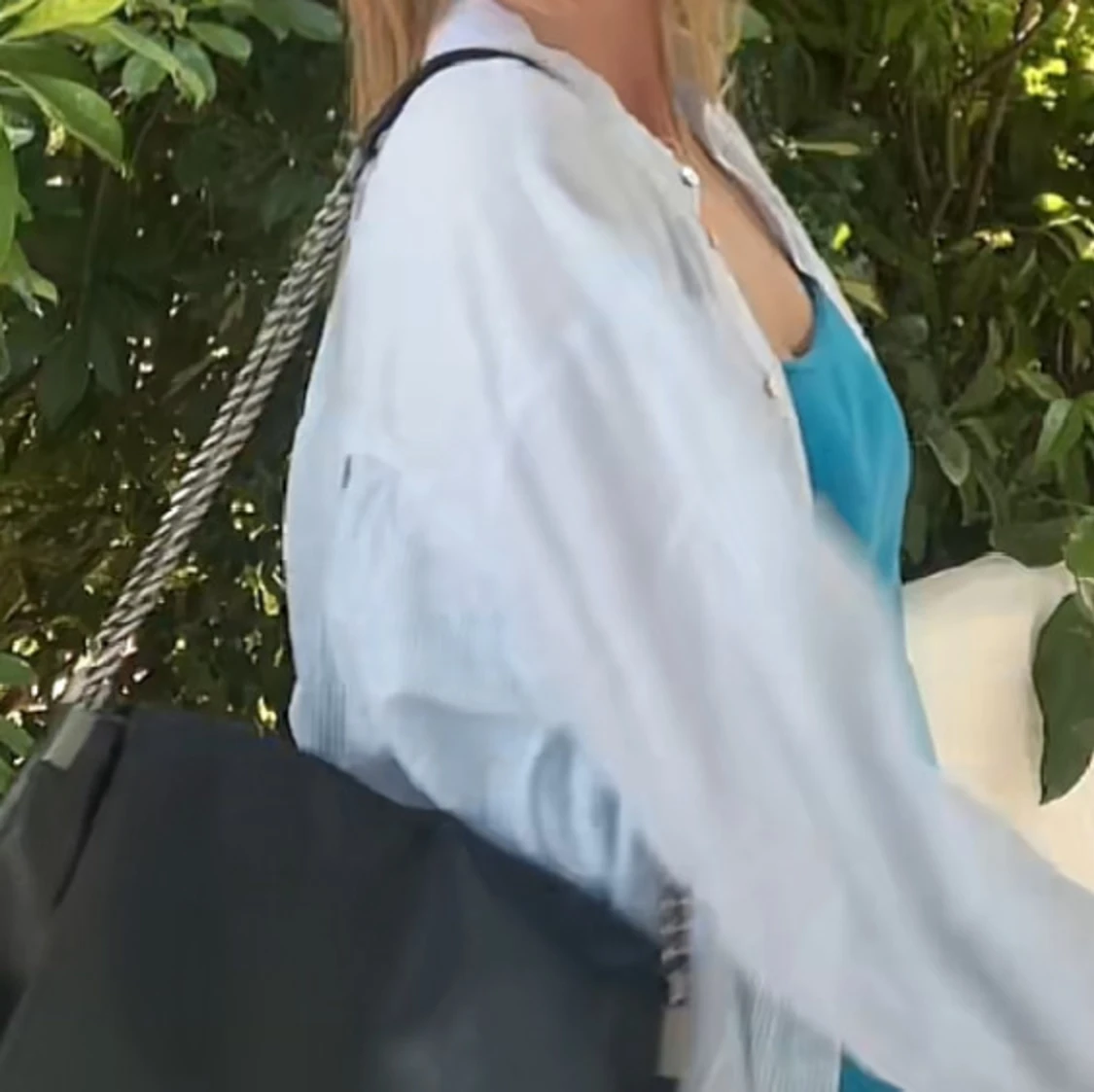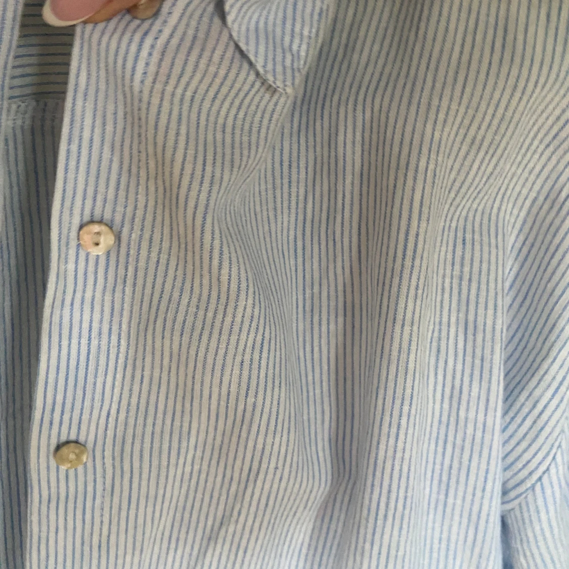 Säljer en stilren blå- och vitrandig skjorta med knappar framtill. Jätte fin att ha till stranden över bikinin!🤍