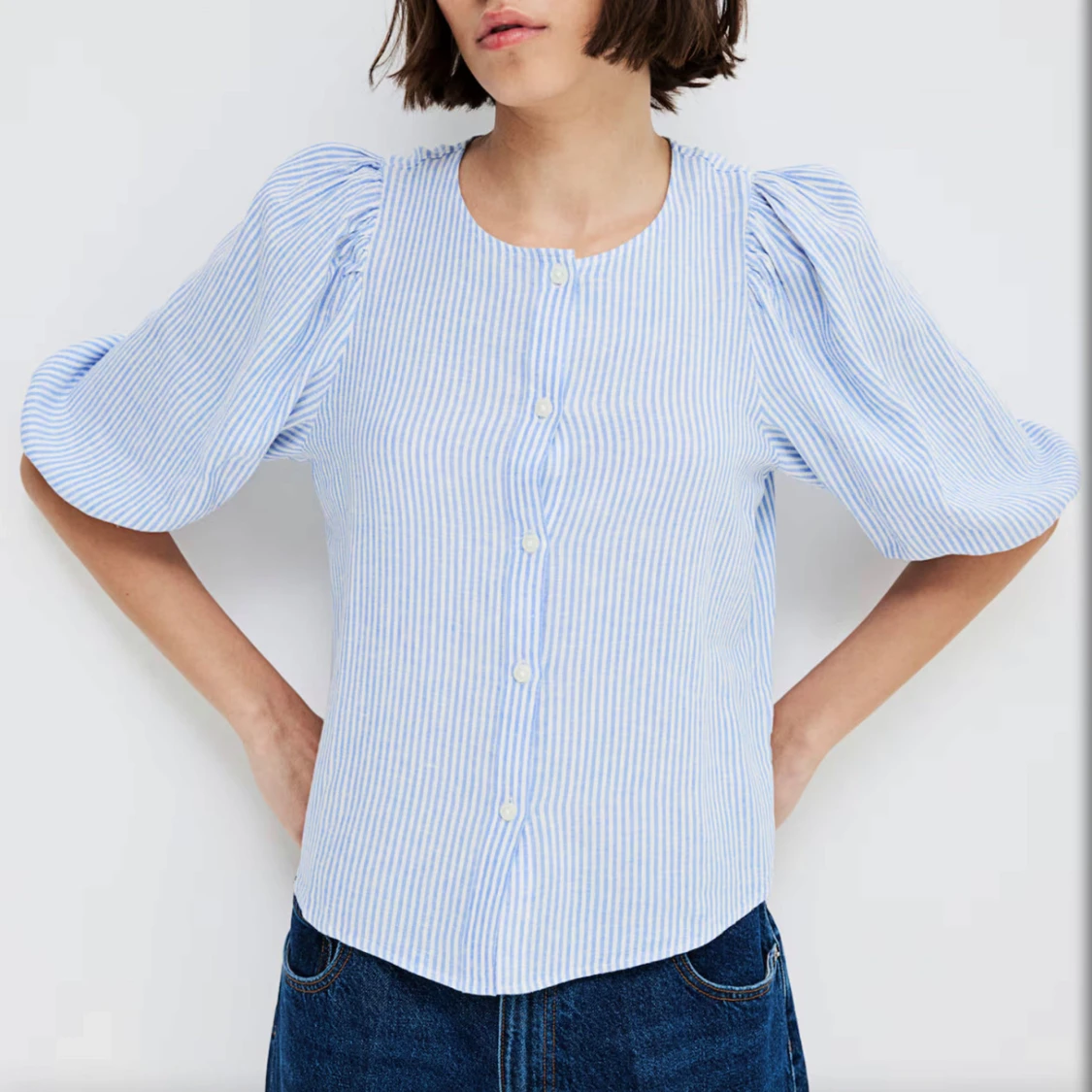 Snygg blus i blåvitt randigt med puffiga trekvartsärmar och rund halsringning. Knappar framtill och lätt, luftig känsla. Perfekt till jeans eller kjol för en fräsch look. Använd en gång🥰🥰🥰