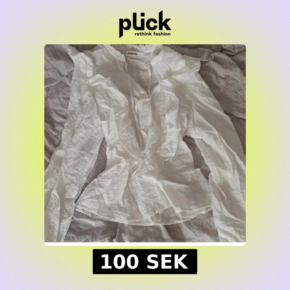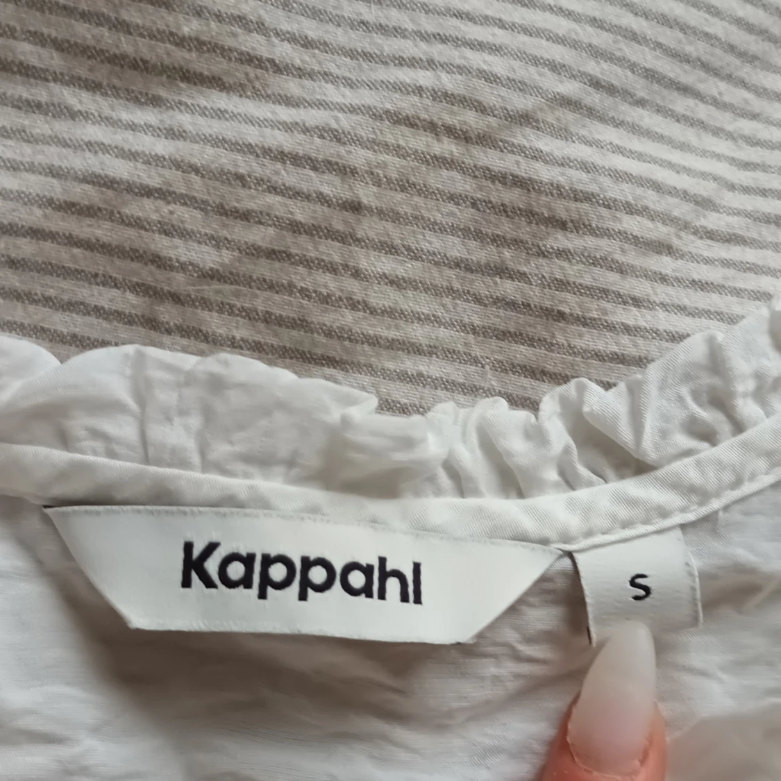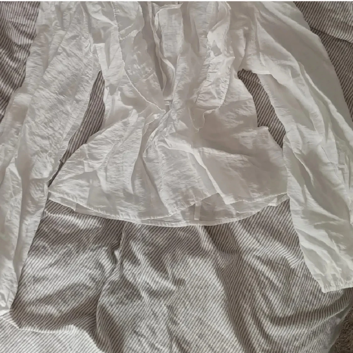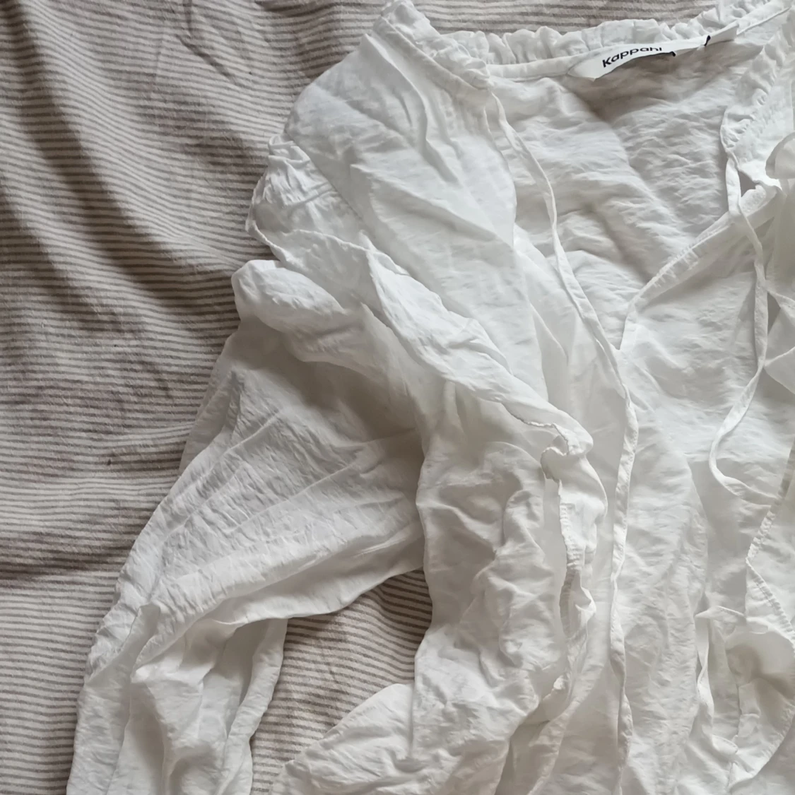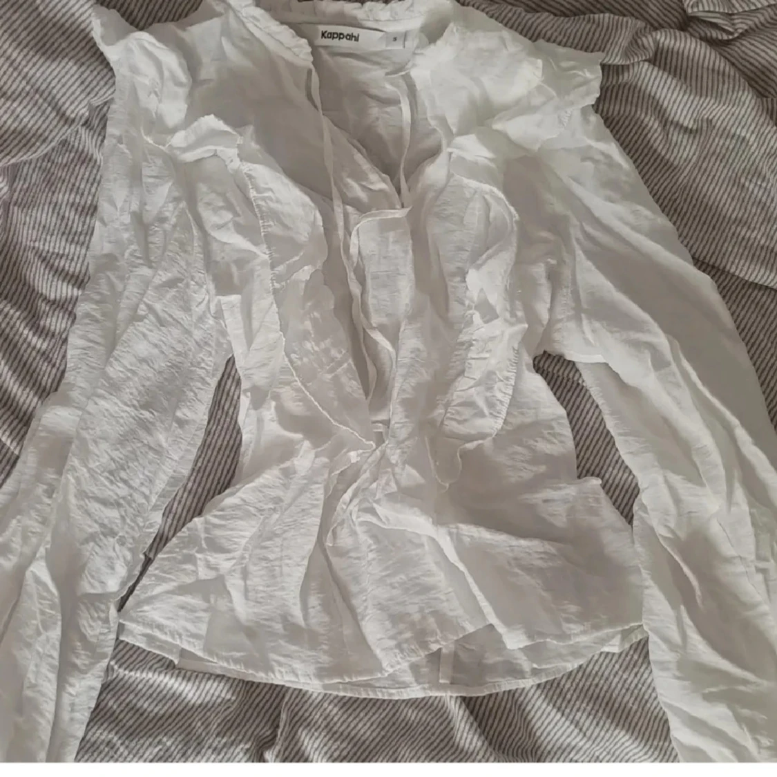 Supersöt vit blus från Kappahl i storlek S. Blusen har långa ärmar, volangdetaljer längs halsringningen och framtill, samt en lätt skrynklig look. Perfekt för dig som gillar romantiska och feminina detaljer.