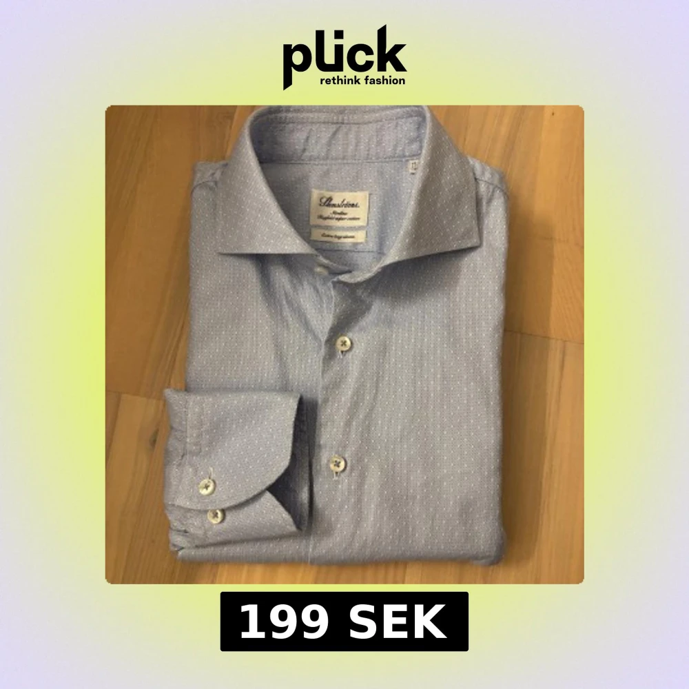 Snygg blå slim fit-skjorta från Stenströms med extra långa ärmar – perfekt för dig som gillar att kunna vika upp eller dra upp ärmarna utan att de känns för korta. Skjortan har ett diskret vitt prickmönster, klassisk krage och vita knappar. Tillverkad i mjuk och exklusiv bomull som ger en fräsch och stilren känsla. Nypris 2000 kr💸Mitt pris 199 kr. Mått: Axelbredd 44 cm, armhåla 48 cm, ärmlängd 73 cm, längd 88 cm.