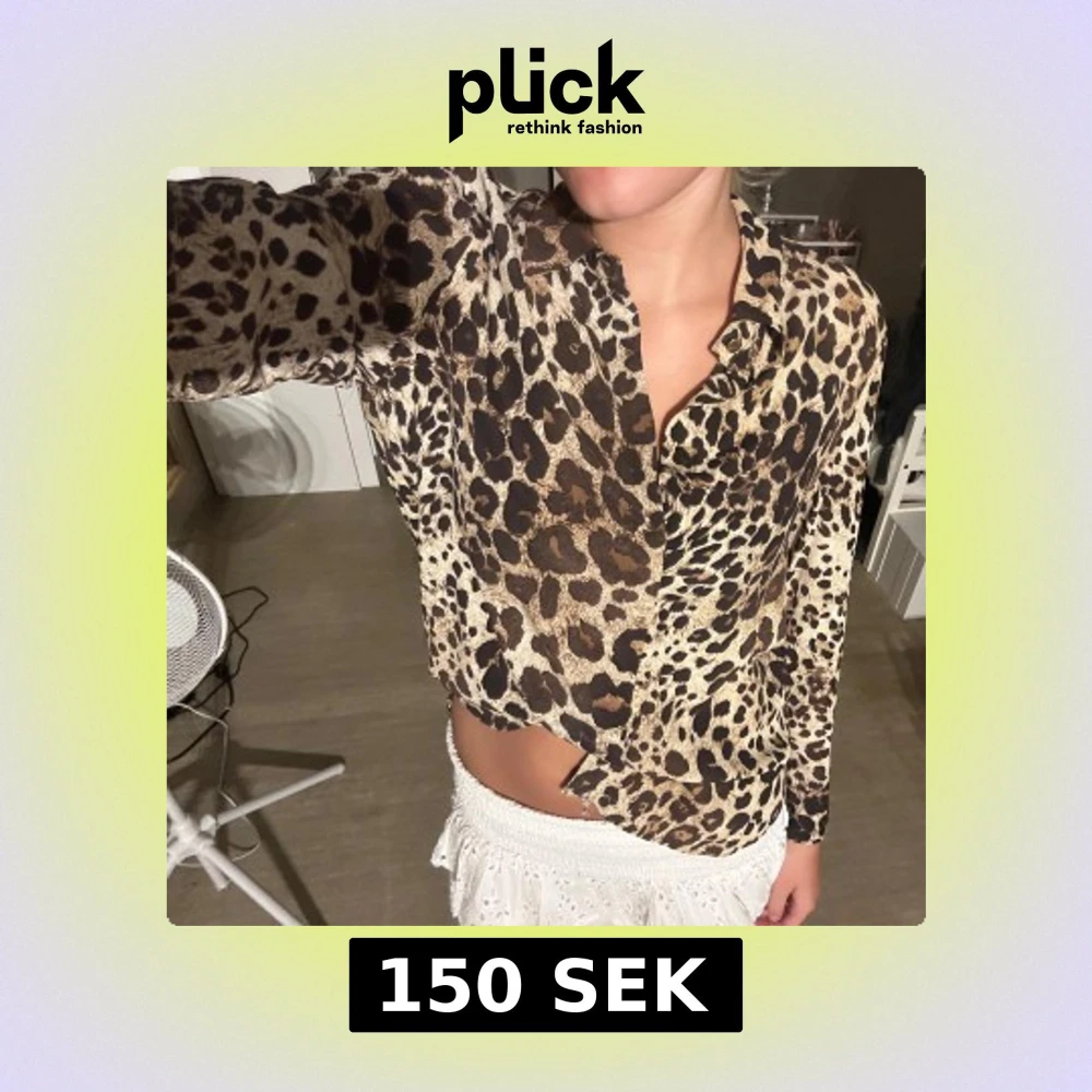Säljer en snygg långärmad skjorta med leopardmönster i bruna och beige toner. Skjortan har klassisk krage och knäppning framtill. Perfekt för dig som vill sticka ut med ett djurmönster och gillar en trendig look.