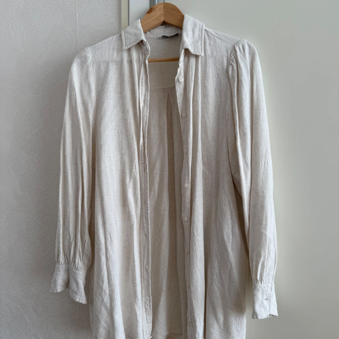 Säljer en stilren beige skjorta i linne med klassisk krage och knäppning framtill. Superskön!