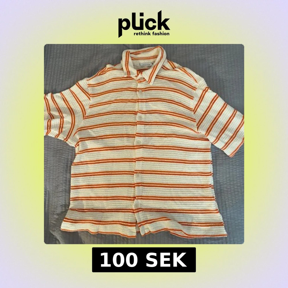 Säljer en snygg randig linneskjorta från Weekday i vitt och orange. Skjortan är kortärmad och har knappar framtill. Perfekt för en avslappnad stil med en unik textur.