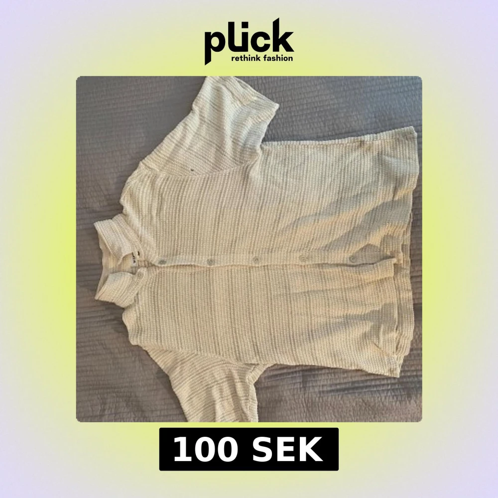 Säljer en beige ribbad skjorta från Weekday. Skjortan har korta ärmar och knappar framtill. Perfekt för en avslappnad stil. Har ett litet hål i ärmen, men inget som syns om man inte kollar noga.