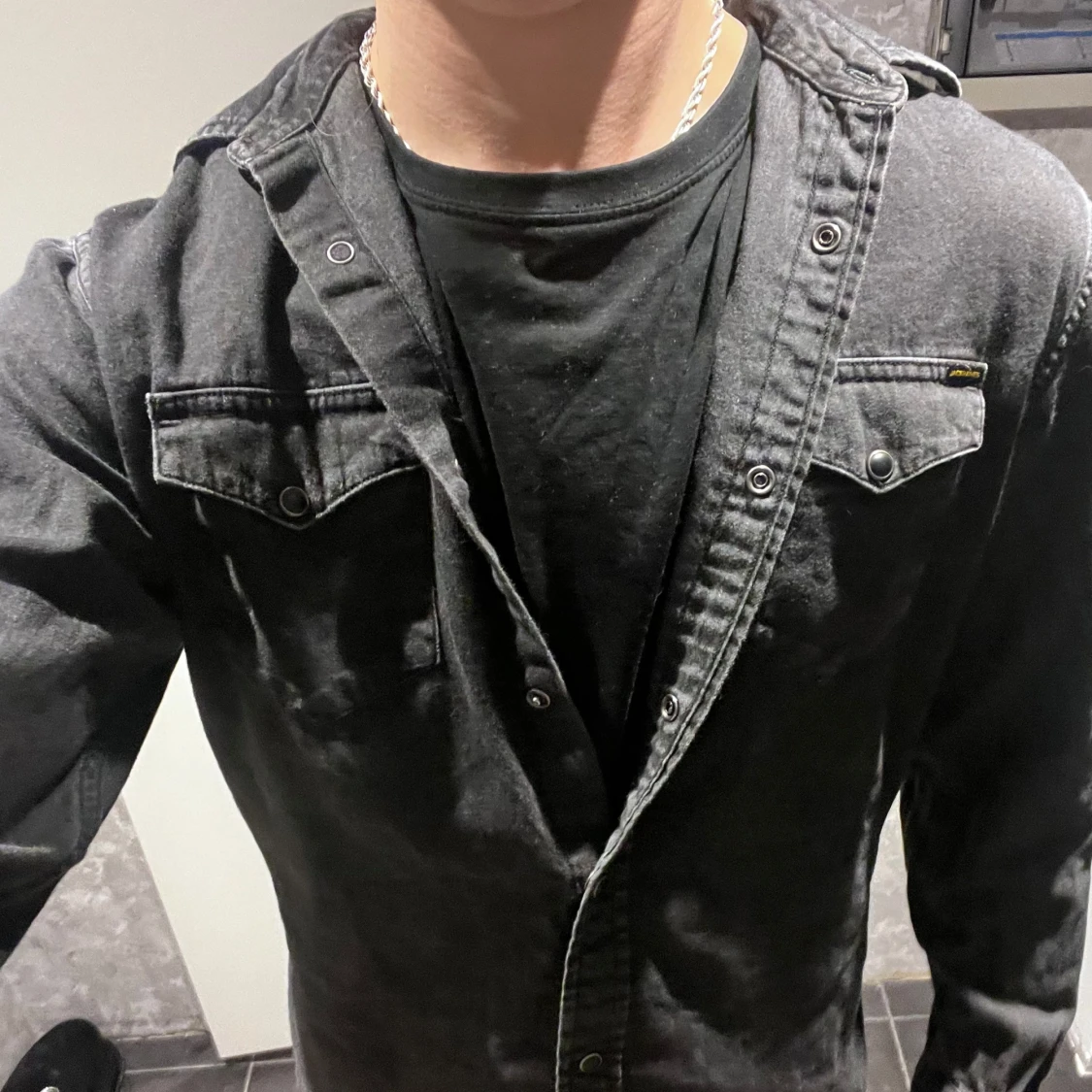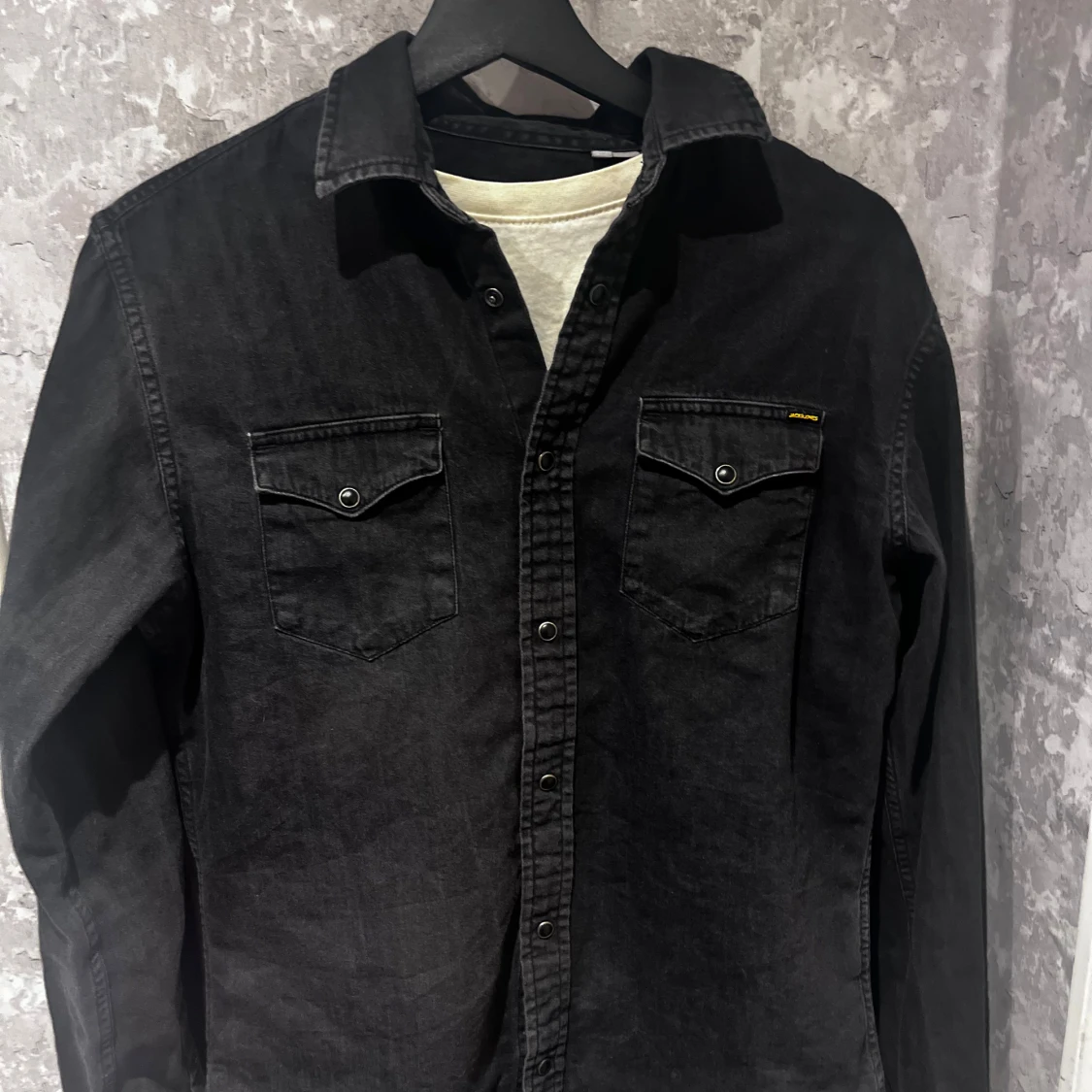 Snygg svart jeansskjorta med knappar och två bröstfickor. Perfekt för en cool och avslappnad stil. Skjortan har långa ärmar och en klassisk krage.
