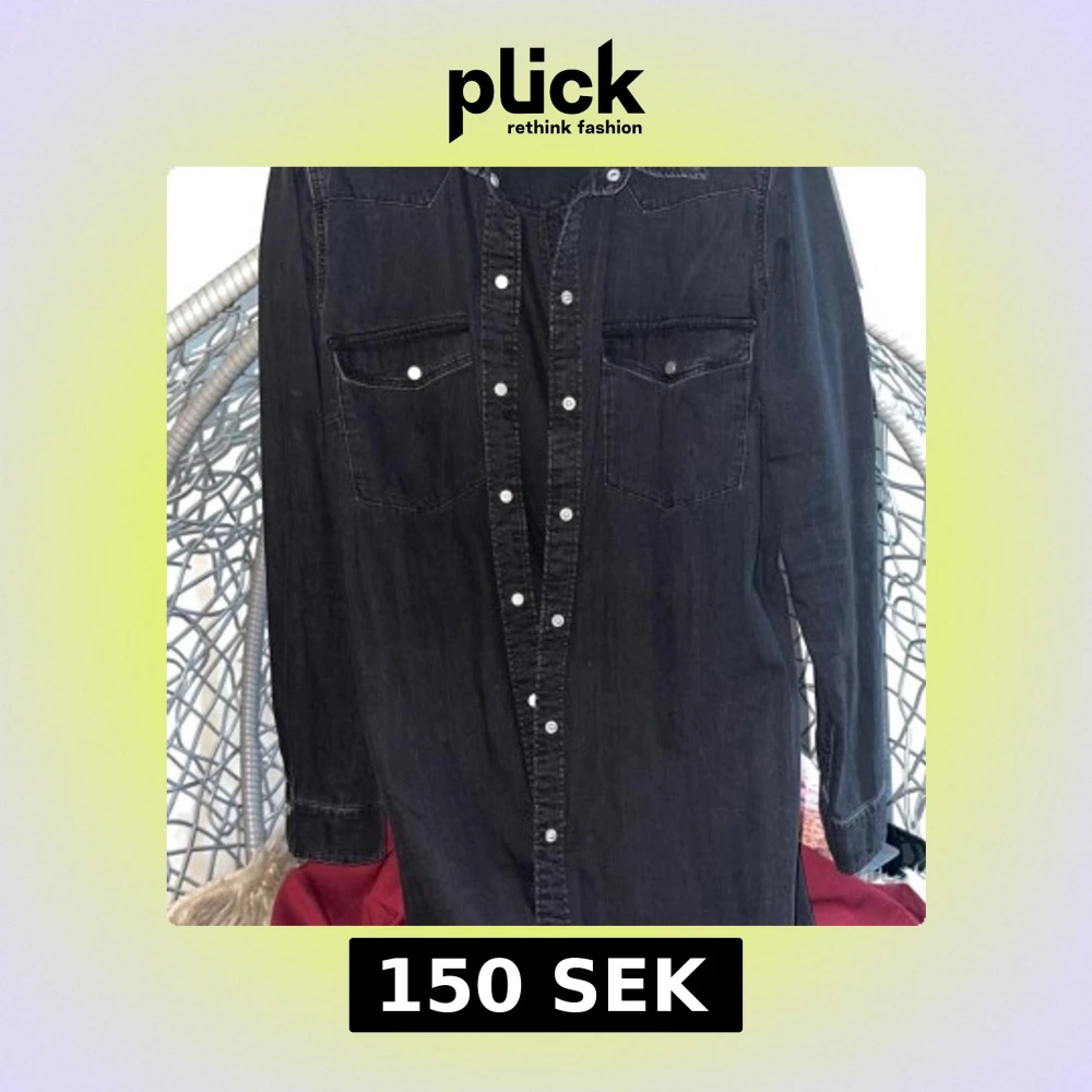 Säljer en svart jeansskjorta med långa ärmar och vita knappar framtill. Skjortan har två bröstfickor med knappstängning och klassisk krage. Perfekt för dig som gillar en cool och avslappnad stil.