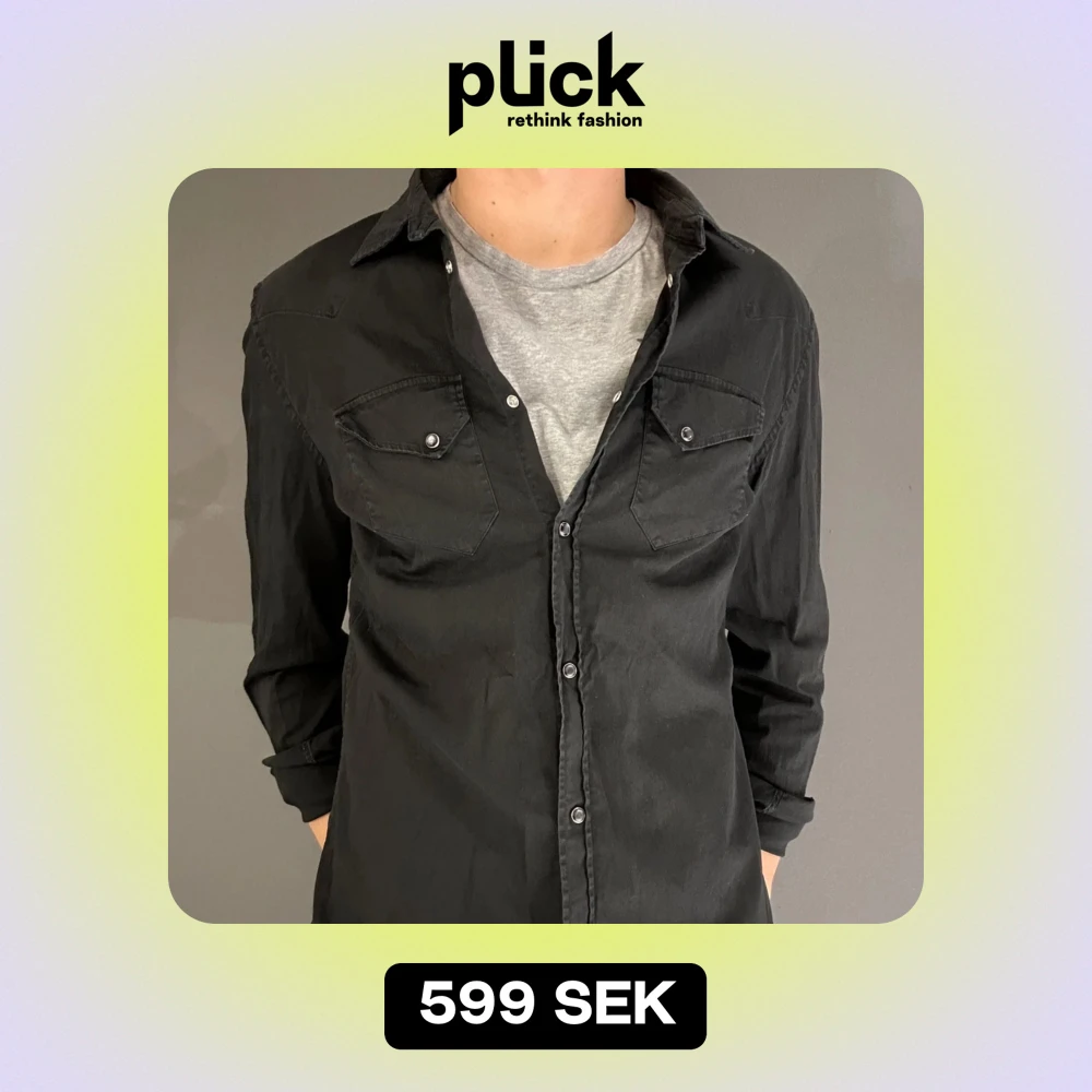 Säljer en stilren svart långärmad skjorta i bra skick. Skjortan har knappar framtill och två bröstfickor med knappdetaljer. Perfekt för både vardag och fest. Passar bra över en t-shirt för en avslappnad look, går även bra över skjorta. L passar M
