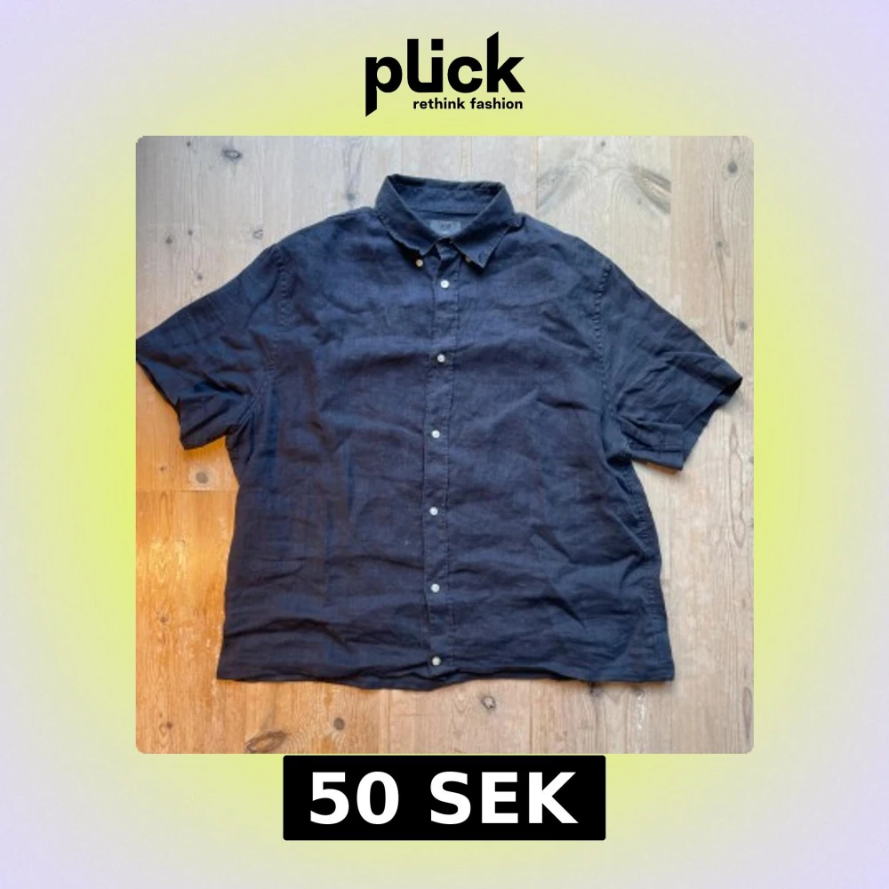 Snygg svart skjorta från H&M i linne med relaxed fit. Skjortan har korta ärmar, klassisk krage och vita knappar framtill. Jag har själv sytt upp den några centimeter så den skulle bli mer kroppad, riktigt snyggt! Skriv vid intresse