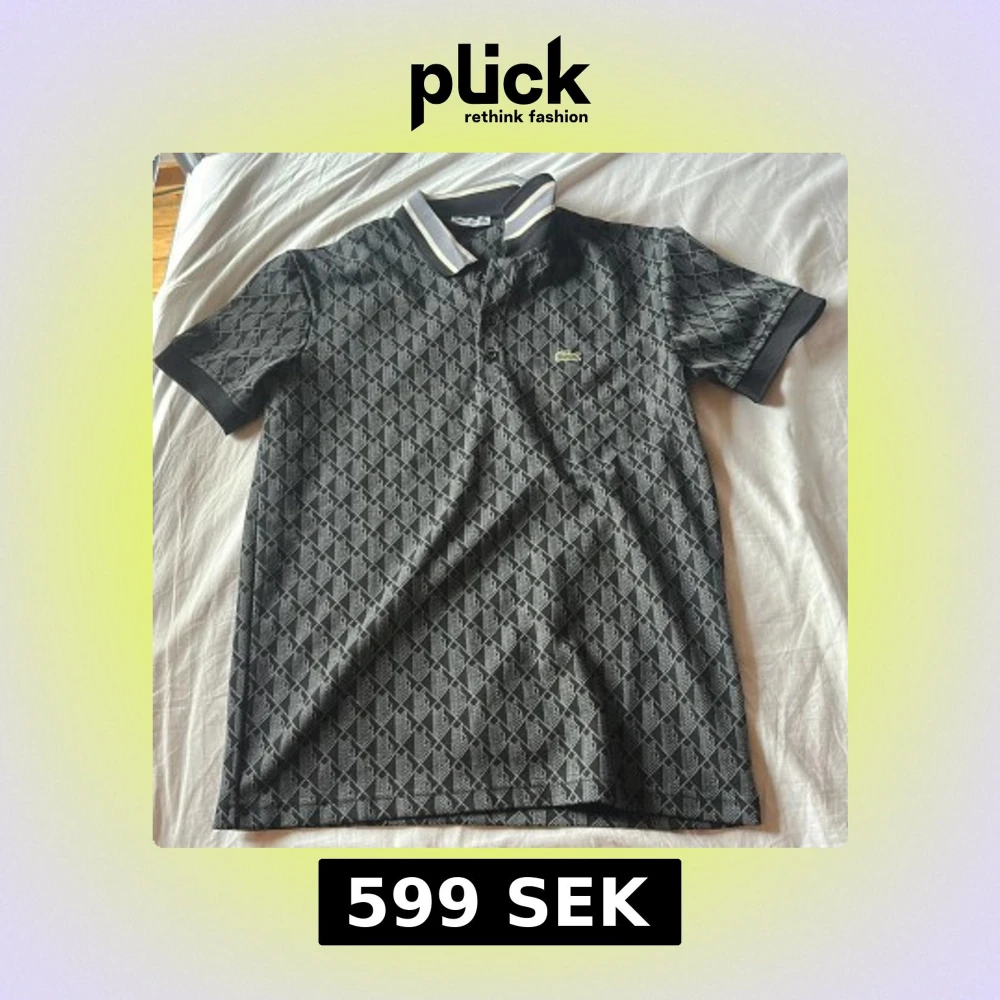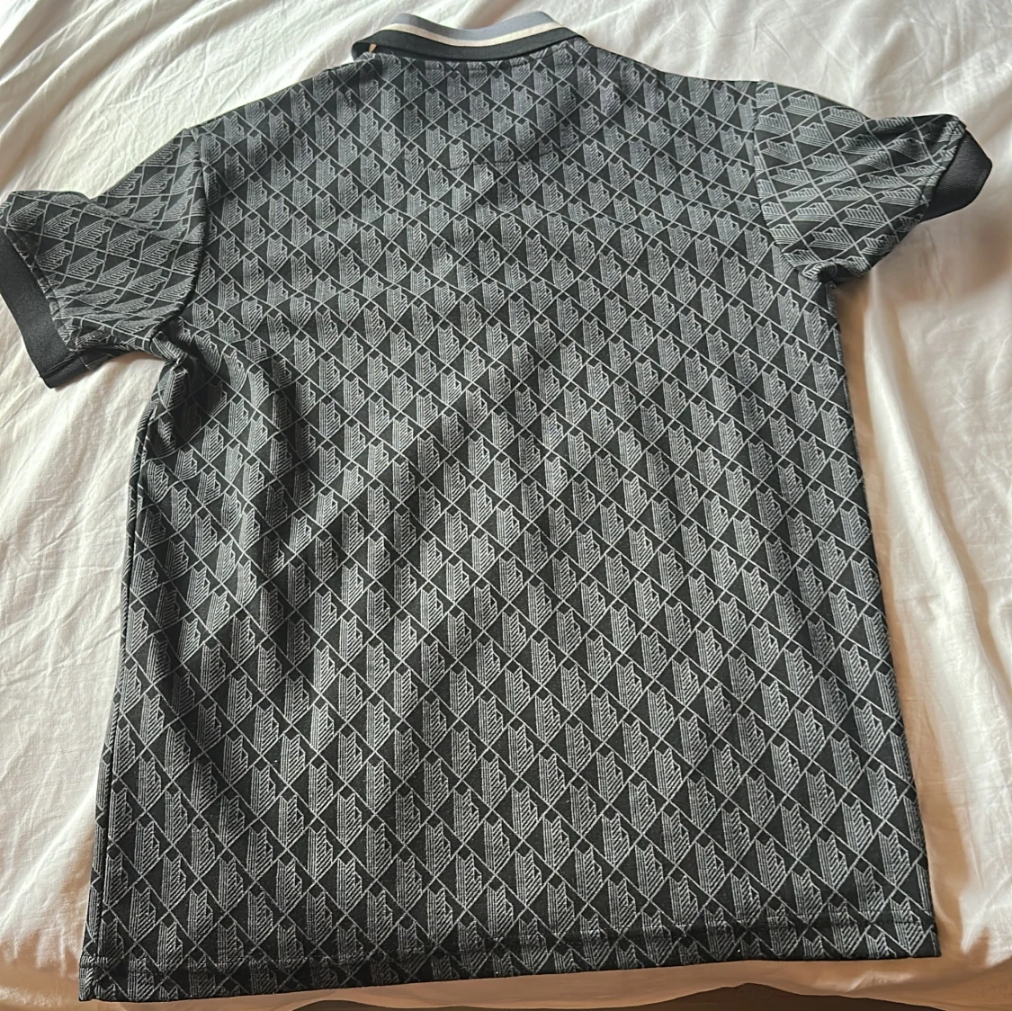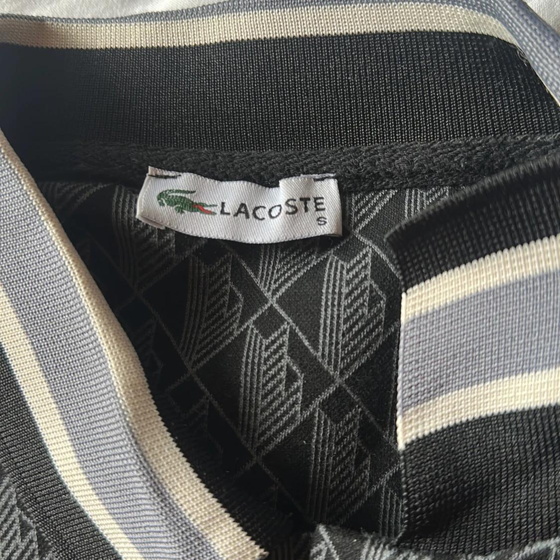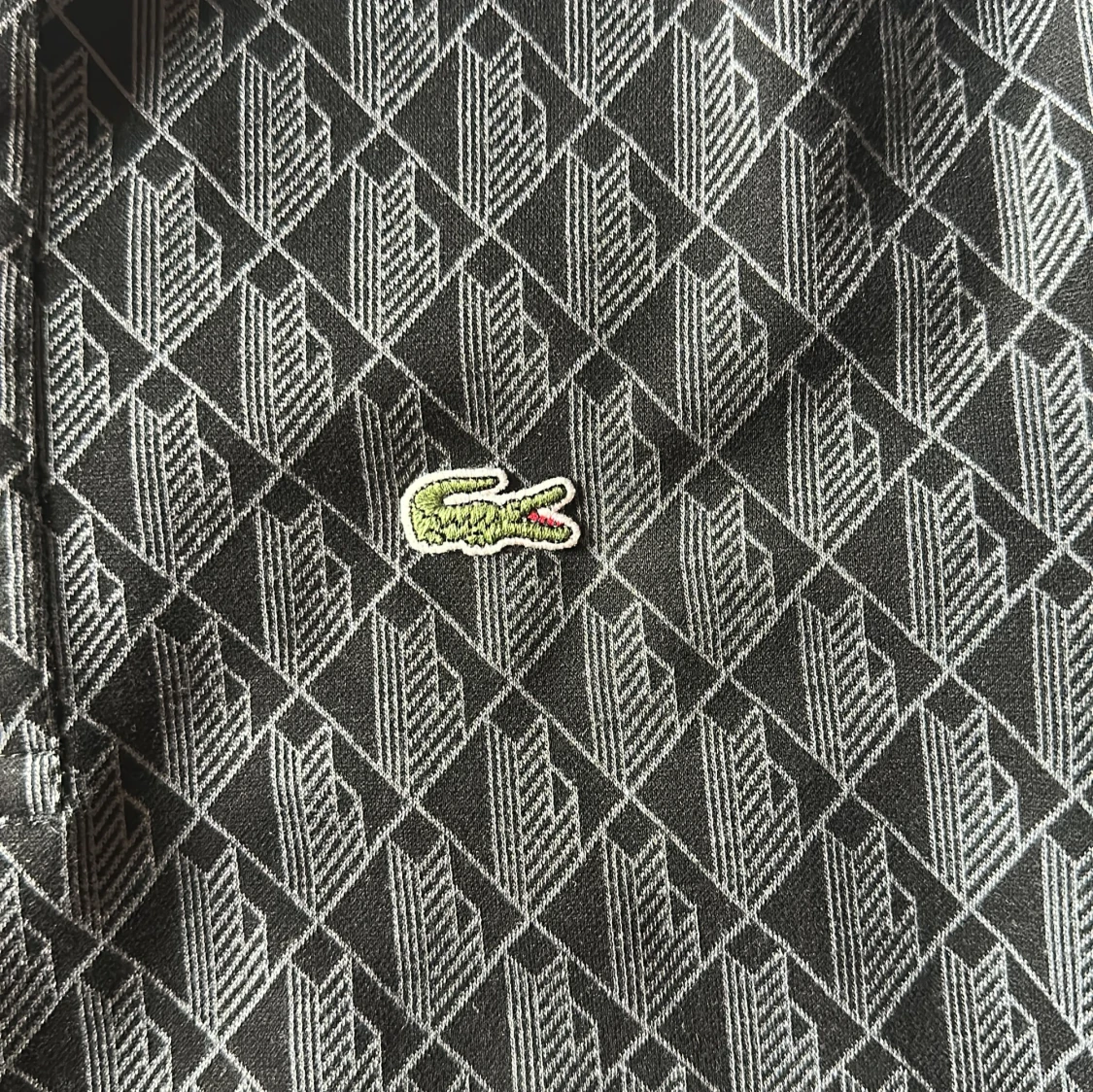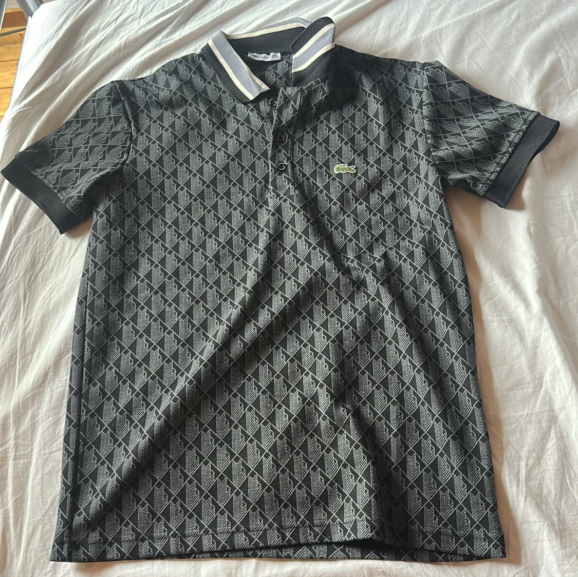 Svart pikétröja från Lacoste i storlek S med grått geometriskt mönster över hela plagget. Klassisk krage med vita och grå ränder, knappar med Lacoste-logga och den ikoniska gröna krokodilen broderad på bröstet. Perfekt för dig som gillar sportig och stilren vibe.