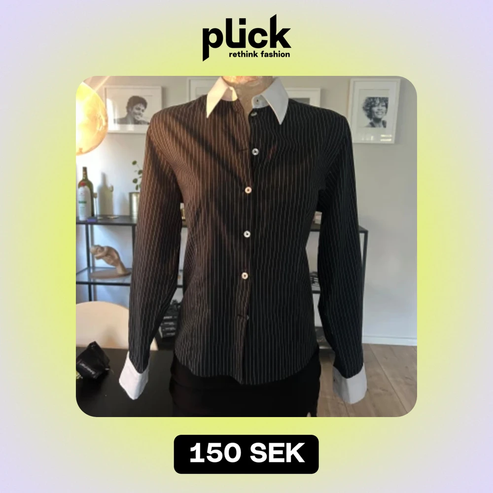 Säljer en stilren svart skjorta med vita ränder och kontrasterande vita krage och manschetter. Skjortan har en slim passform och långa ärmar med knappar fram! Storlek 38 på lappen men passar mer 34/36