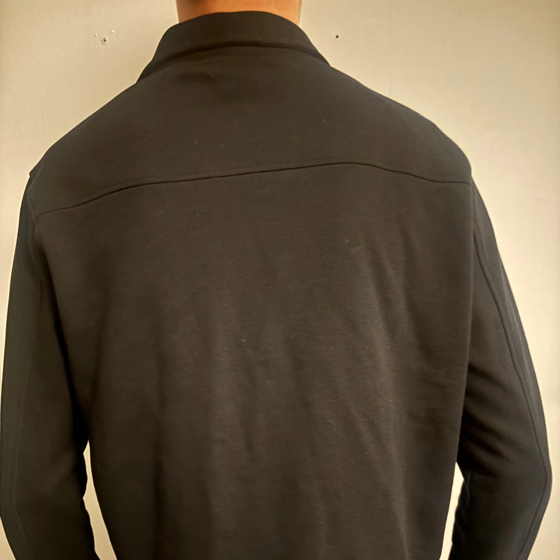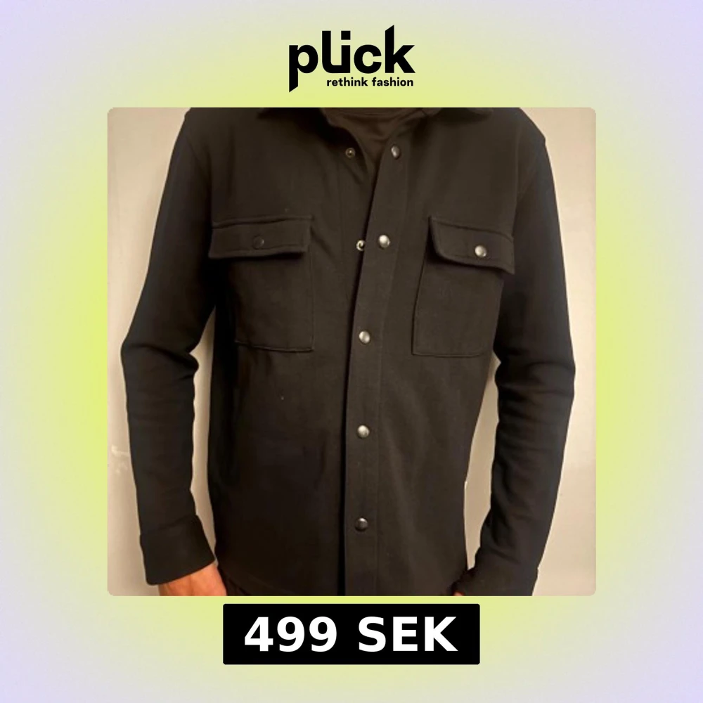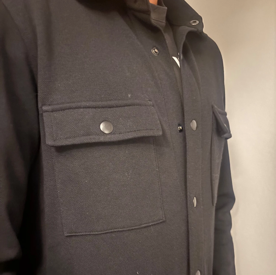 Stilren svart overshirt med raka linjer och två stora bröstfickor med lock och tryckknappar. Skjortan har klassisk krage och långa ärmar. Perfekt att bära öppen eller stängd för en clean look.