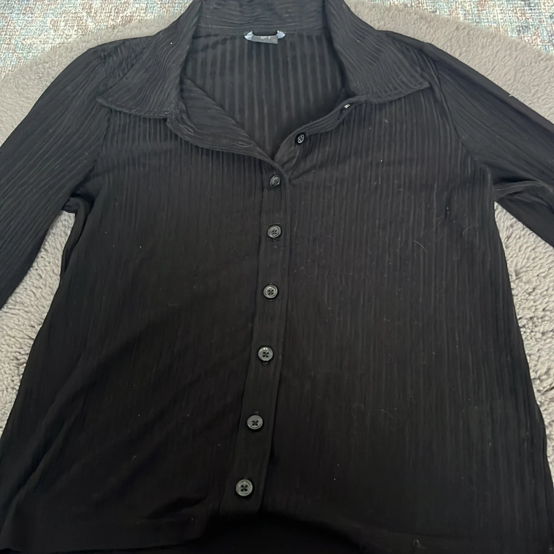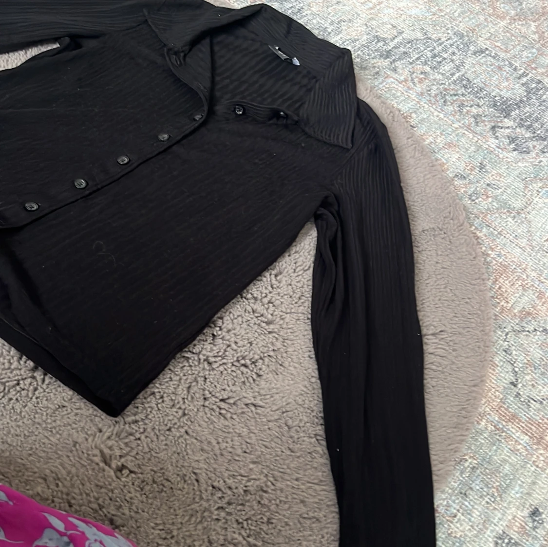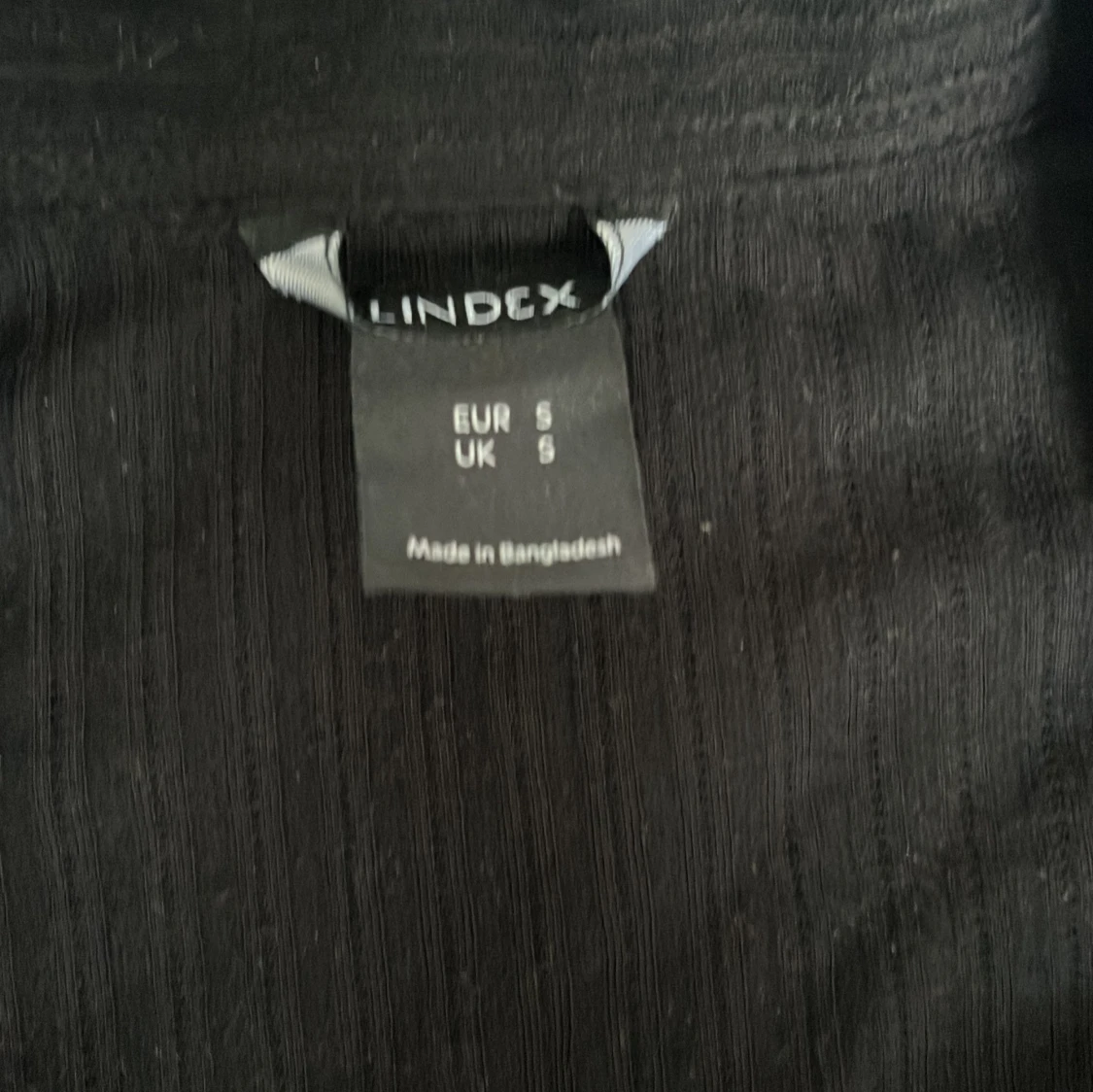 Svart skjorta/tröja från Lindex i storlek S med diskret randigt mönster. Skjortan har långa ärmar, klassisk krage och knappar hela vägen framtill. Materialet känns mjukt och lätt, perfekt för en chill och stilren look. använt fåtal gånger
