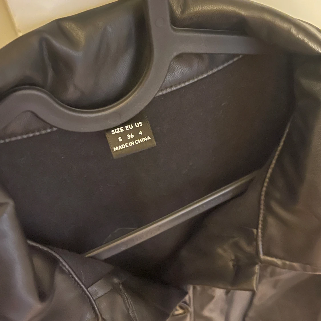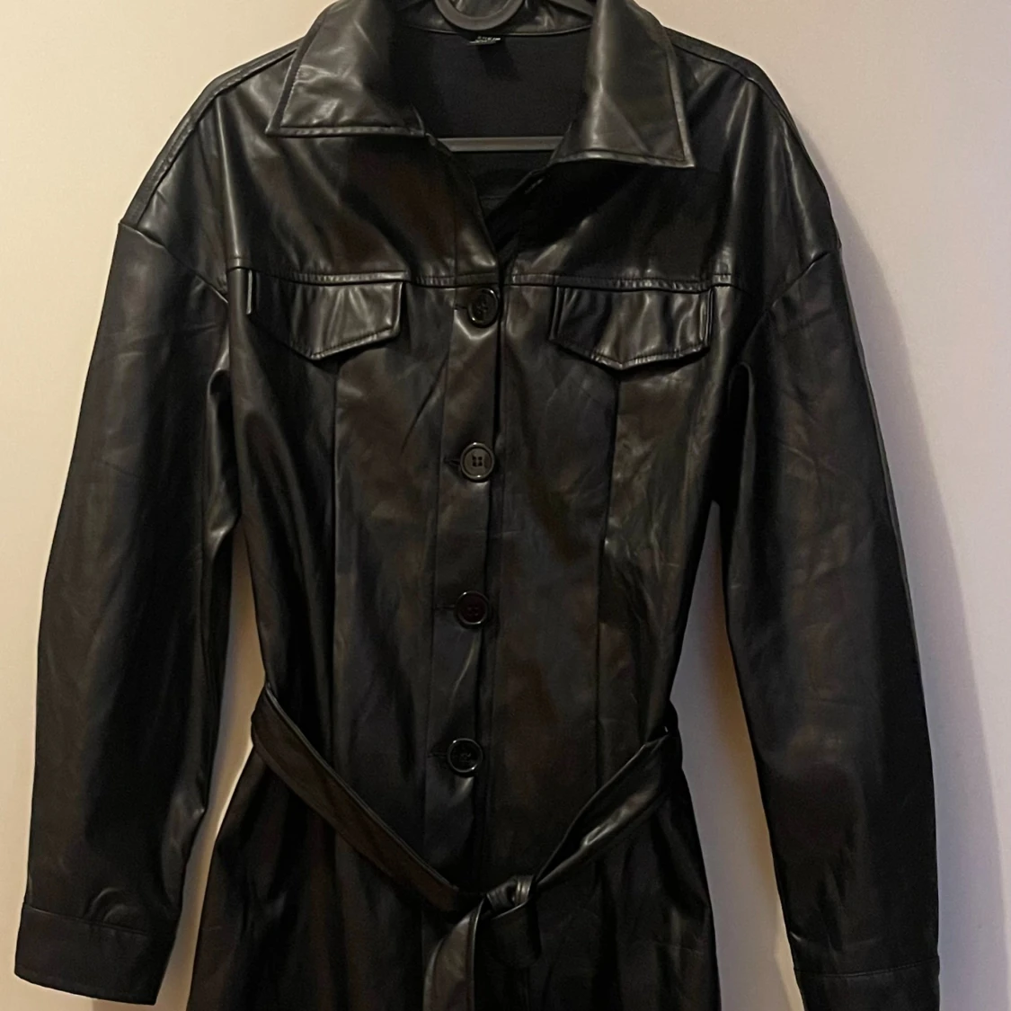 Snygg svart skinnjacka i längre modell med bälte i midjan och stora knappar framtill. Jackan har klassisk krage, två bröstfickor med lock och långa ärmar. Perfekt för dig som vill ha en edgy och stilren look.