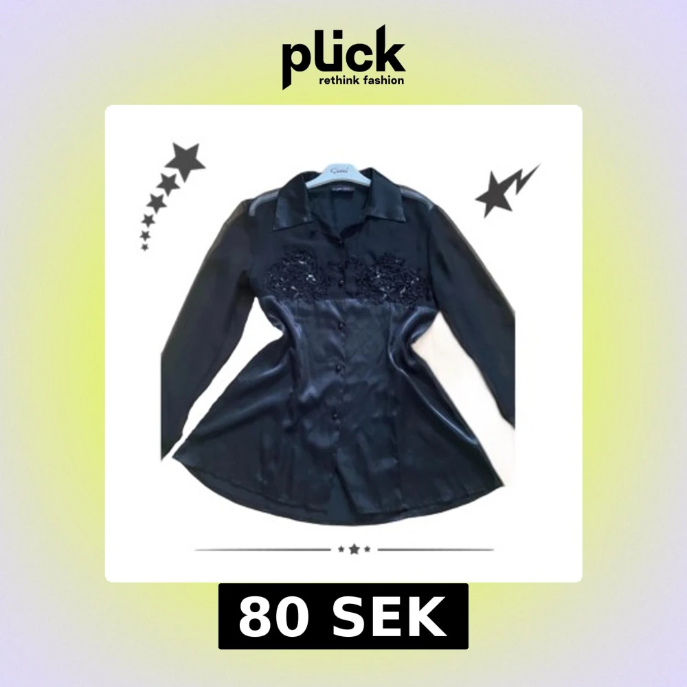 Elegant svart skjorta/blus från Paris City Mode med långa, transparenta ärmar och spetsdetaljer på boobiesarna. ”Thriftad” från Sellpy men i gott skick! Storlek M enligt annonsen (står inget på lappen) men skulle säga att den passar mer som en S-M när knäppt. Läs gärna bion innan köp.