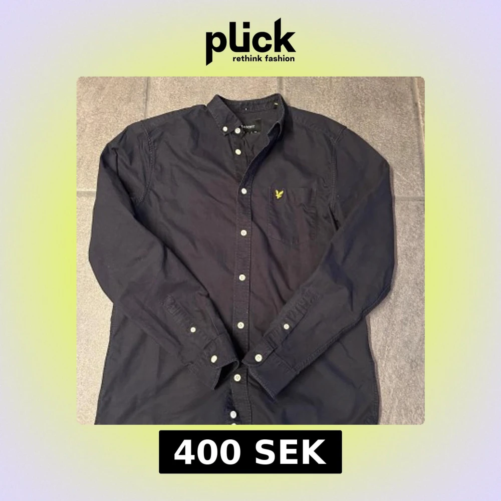 Säljer en stilren svart skjorta från Lyle & Scott med klassisk krage och knappar framtill. Skjortan har en broderad logotyp i gult på bröstfickan och långa ärmar med knappstängning vid ärmsluten.