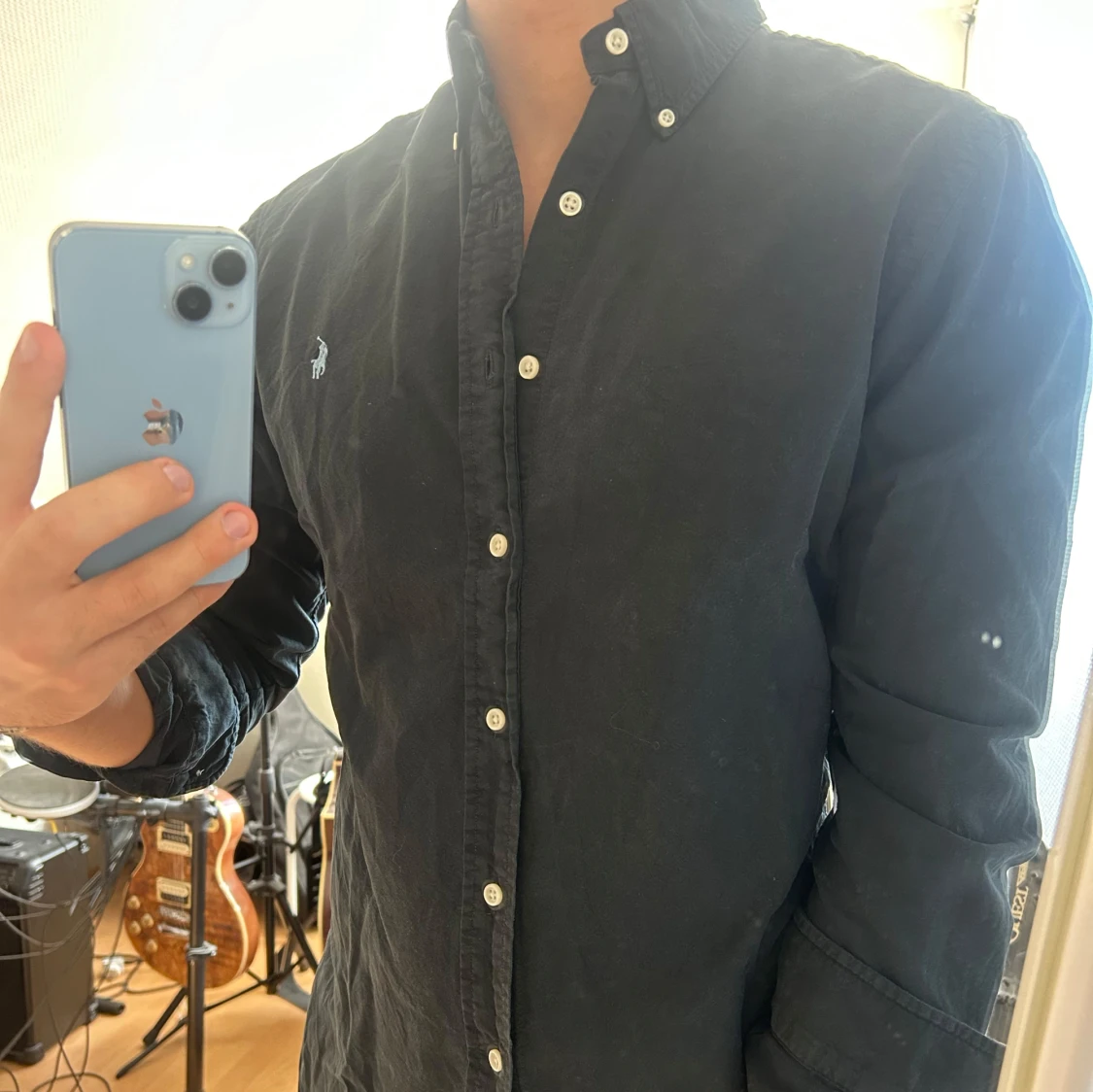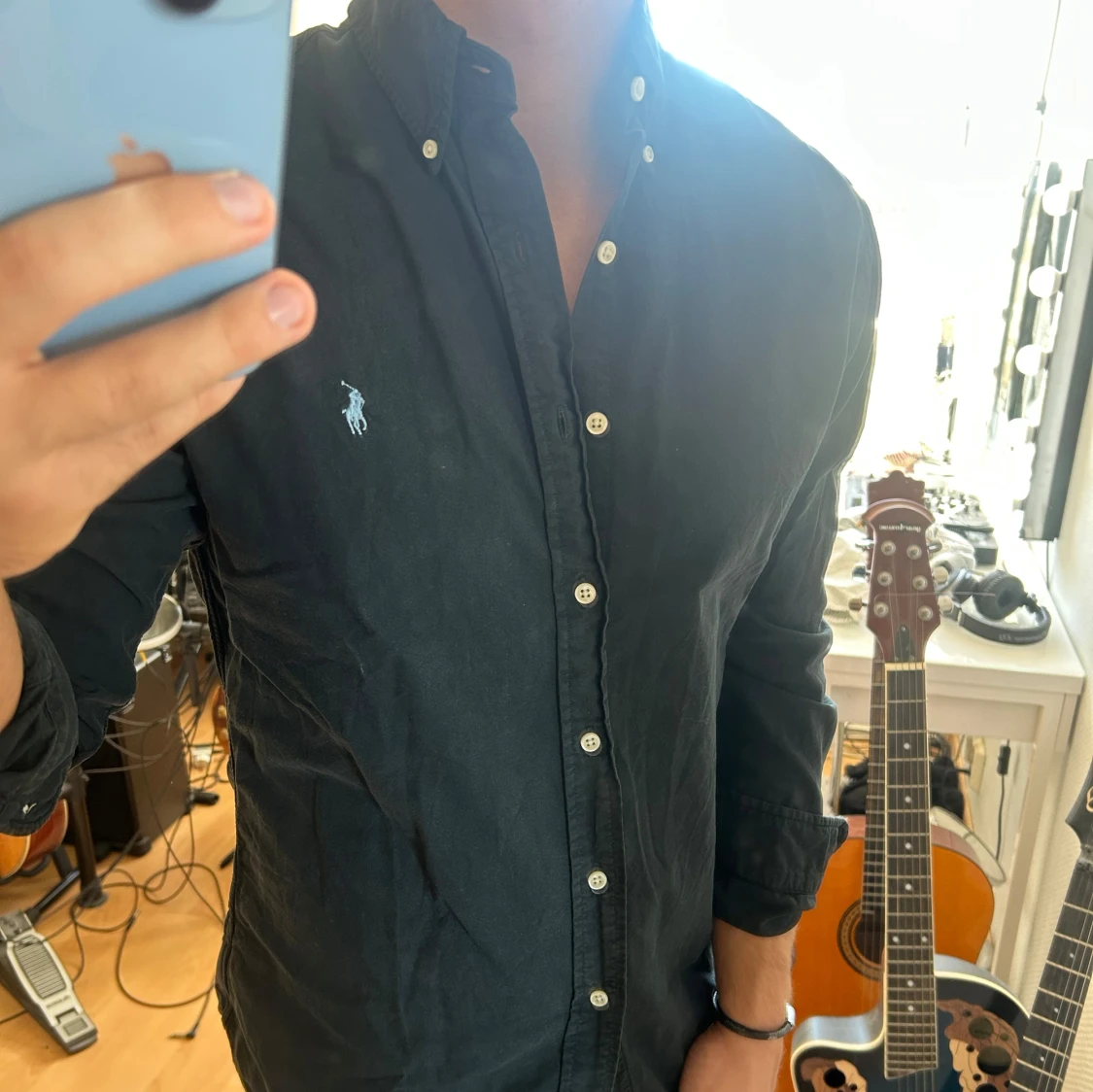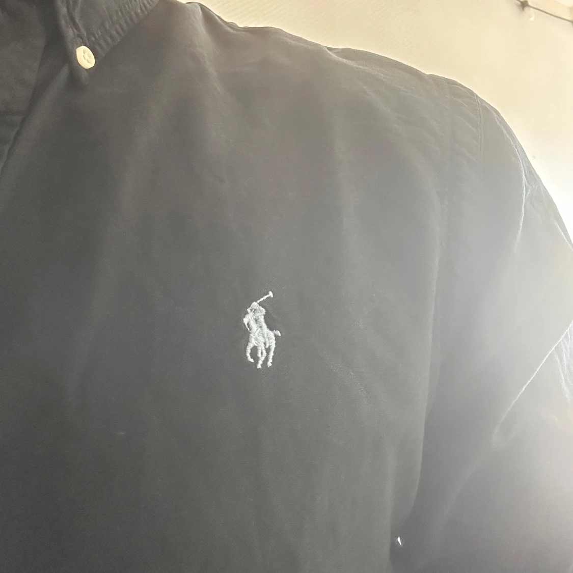 Behövs strykas. Klassisk svart skjorta från Ralph Lauren med vit broderad logga på bröstet. Skjortan har button-down krage, vita knappar och lång ärm. Tillverkad i mjuk bomull och har en normal passform som funkar till många olika stilar.