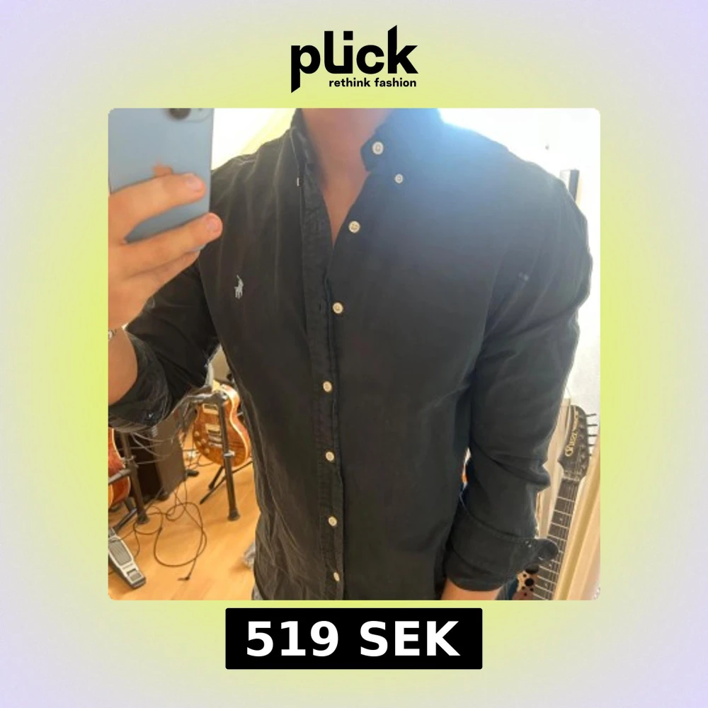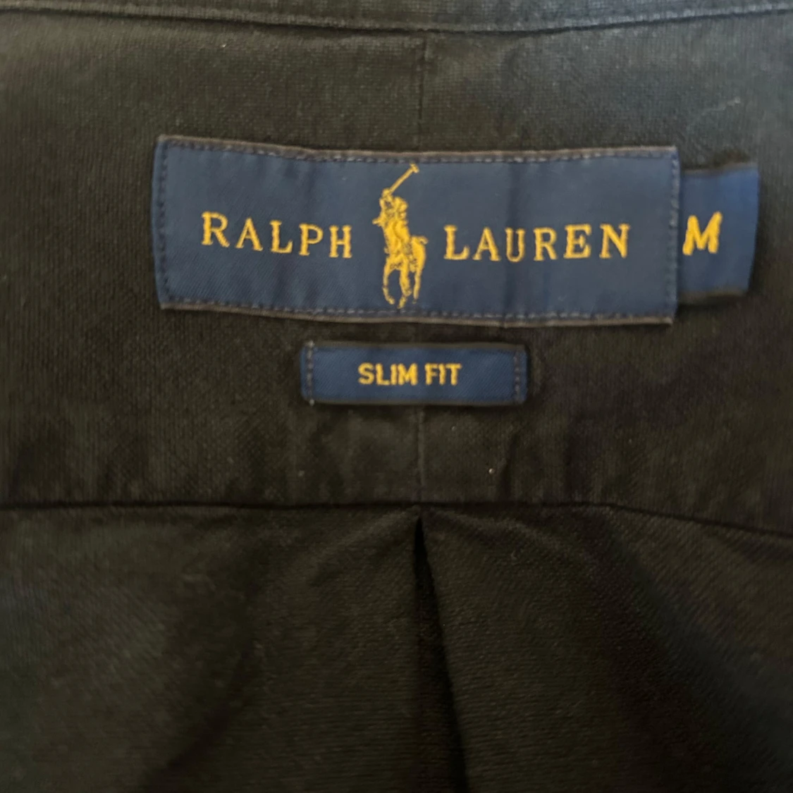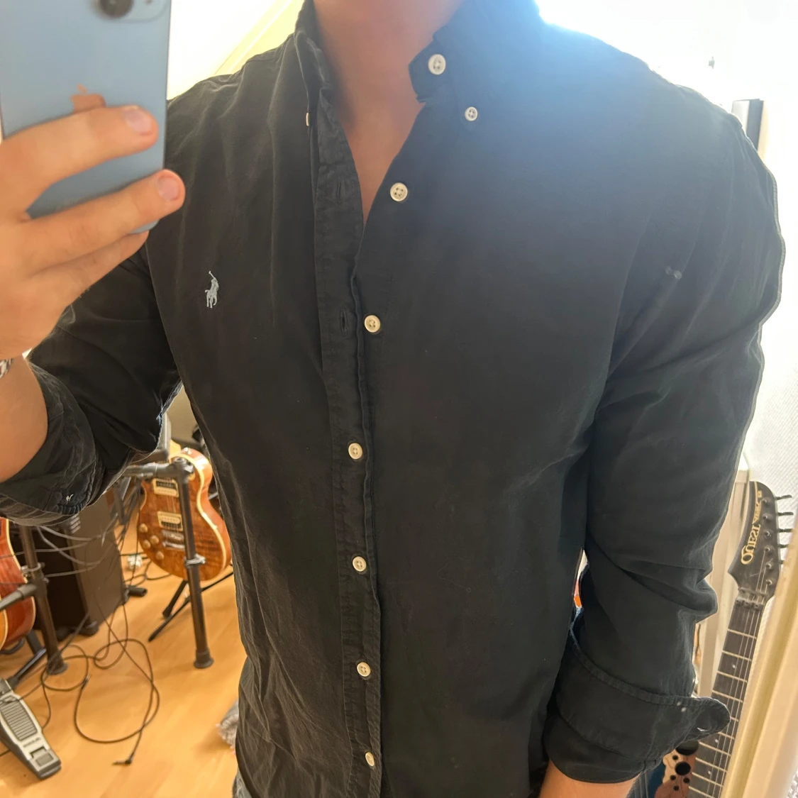 Behövs strykas. Klassisk svart skjorta från Ralph Lauren med vit broderad logga på bröstet. Skjortan har button-down krage, vita knappar och lång ärm. Tillverkad i mjuk bomull och har en normal passform som funkar till många olika stilar.