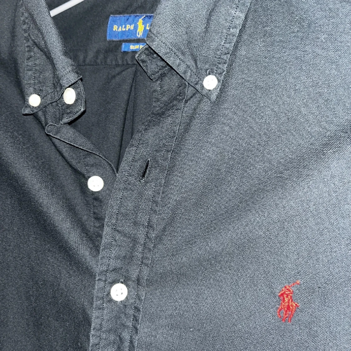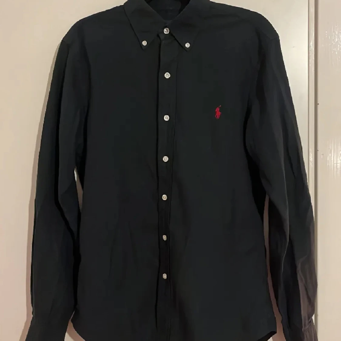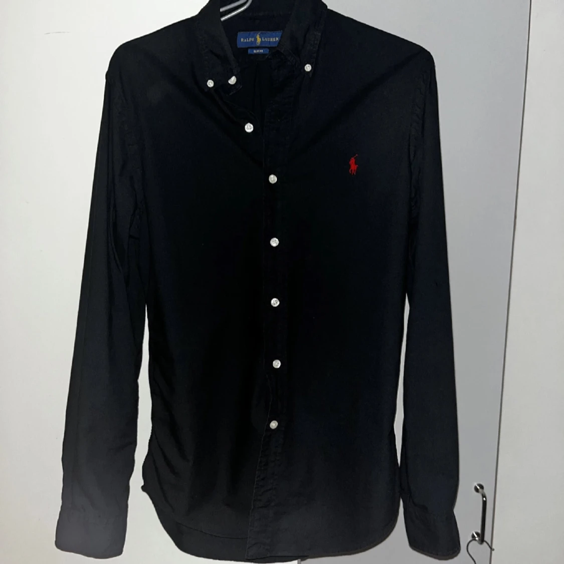 Snygg svart skjorta från Ralph Lauren med klassisk krage och knappar framtill. Den har en broderad röd logotyp på bröstet som ger en stilren touch. Perfekt för en elegant look. Storlek S passar M (jag är 182)