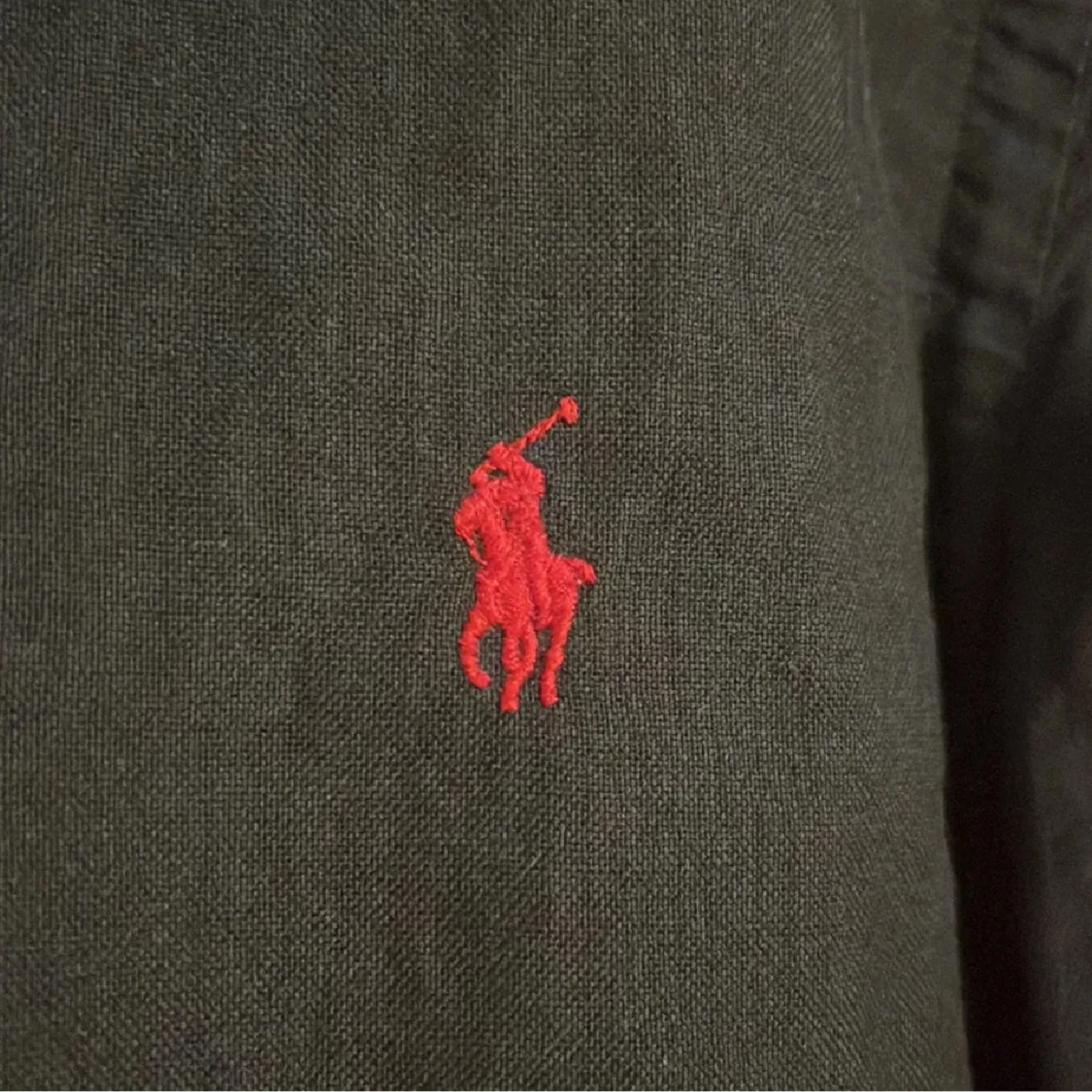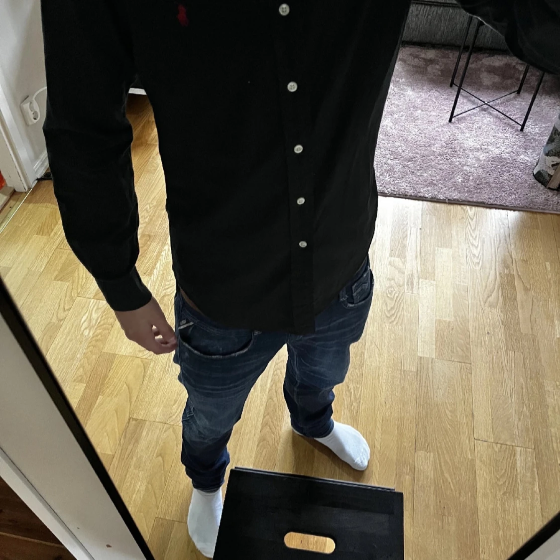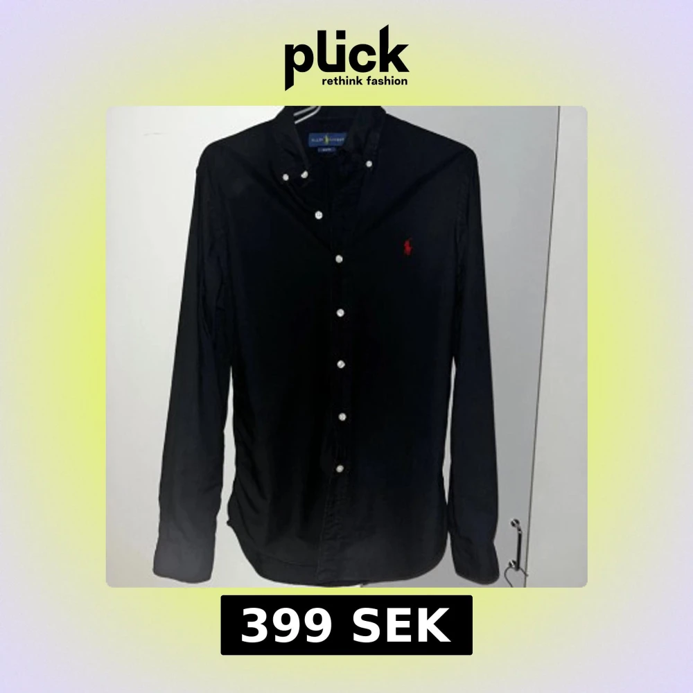 Snygg svart skjorta från Ralph Lauren med klassisk krage och knappar framtill. Den har en broderad röd logotyp på bröstet som ger en stilren touch. Perfekt för en elegant look. Storlek S passar M (jag är 182)
