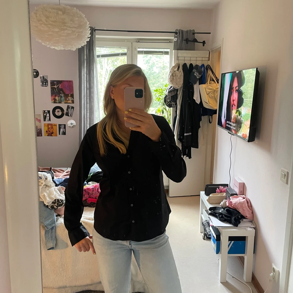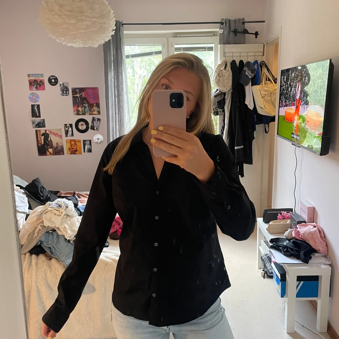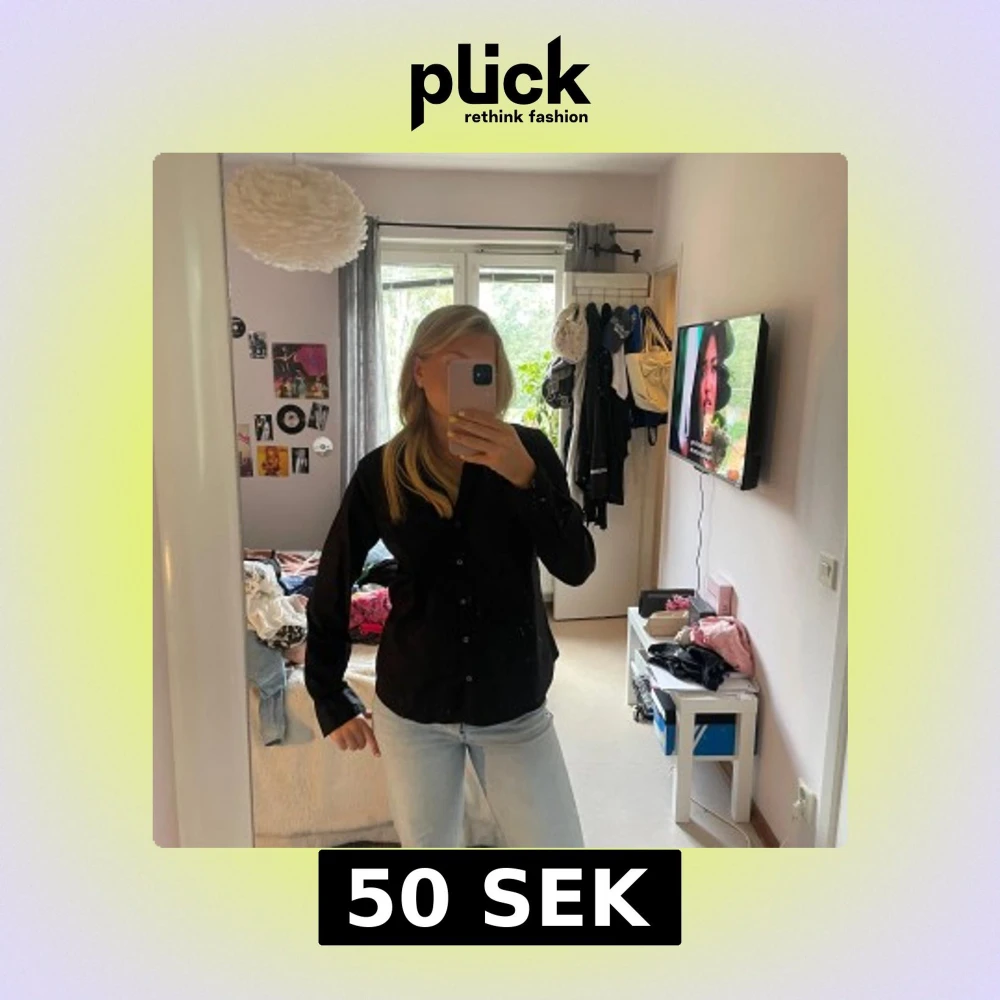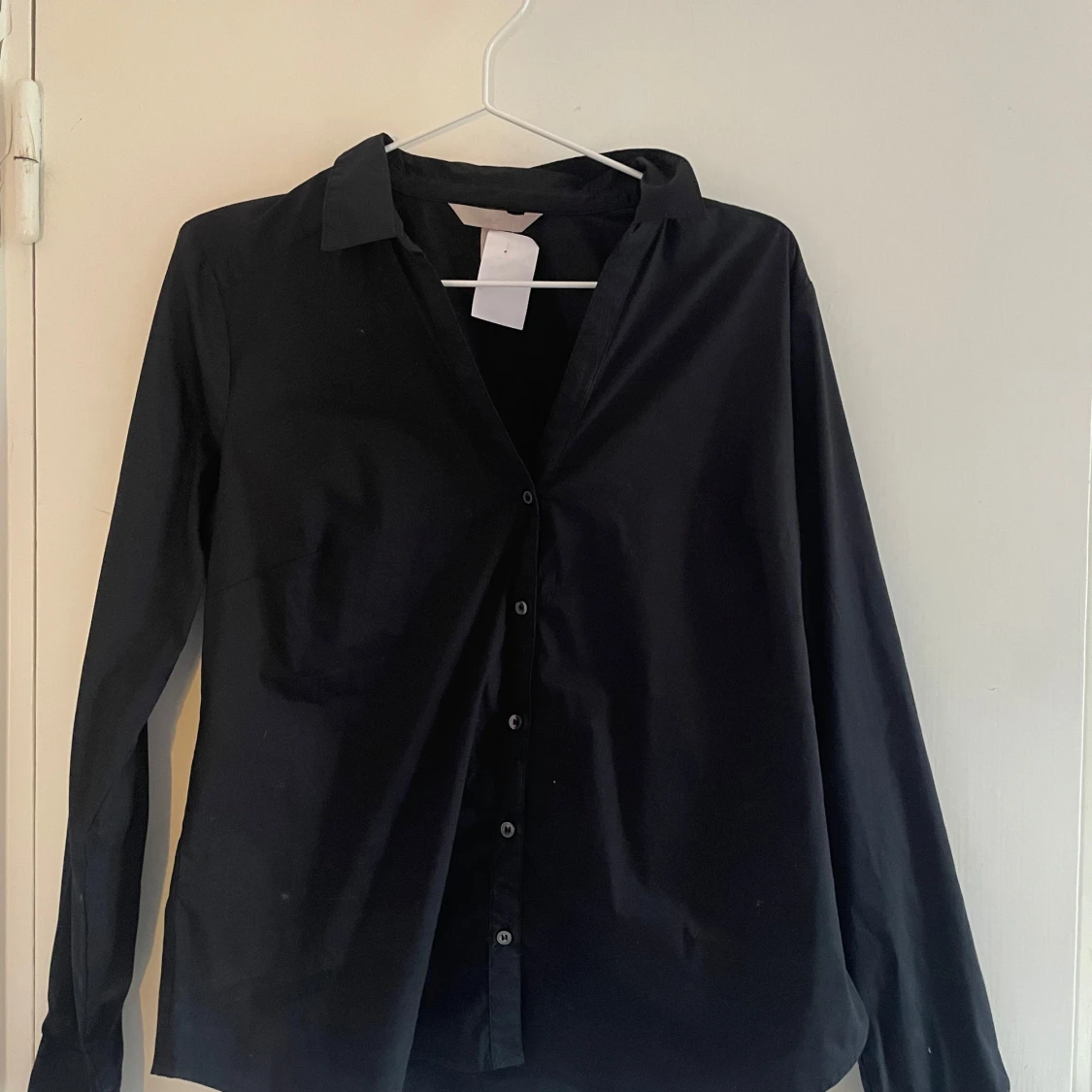 Stilren svart skjorta från H&M i storlek 42 men passar mig som har S. Klassisk krage, långärmad och med knappar hela vägen framtill. Skjortan har en rak passform och är gjord i mjuk bomull som känns skön mot huden. Perfekt att matcha med jeans eller kjol för en clean look.