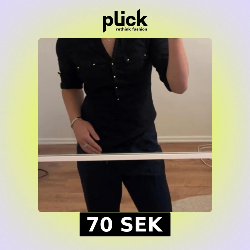 Svart skjorta med knapp-detaljer i guldfärg. Har vikt upp ärmarna, men man kan vika ut dem så det blir en hel armlängd. Använd, men inga tecken på slitage. Storlek M, men passar även S