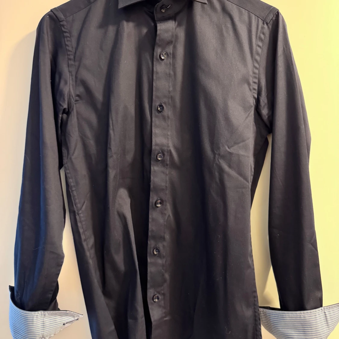 Snygg svart skjorta med långa ärmar och knappar framtill. Perfekt för en stilren look. Ärmsluten har en kontrasterande randig insida som ger en extra touch när de viks upp. Endast använd en gång.