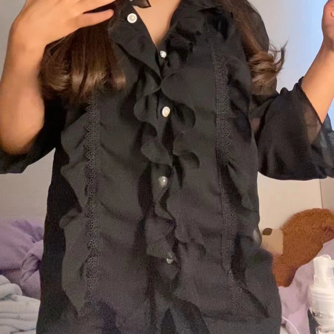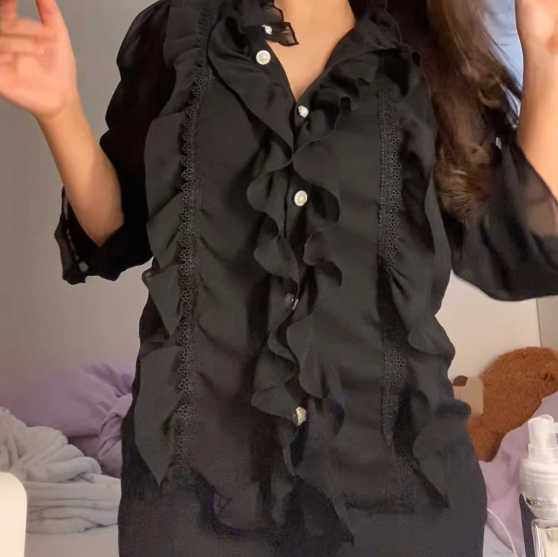 Svart söt skjorta med volanger längs knäppningen och spetsdetaljer på framsidan. Skjortan har pärlemorknappar och är tillverkad i ett lätt, transparent tyg med trekvartsärm. Perfekt för dig som gillar en extra touch på outfiten.