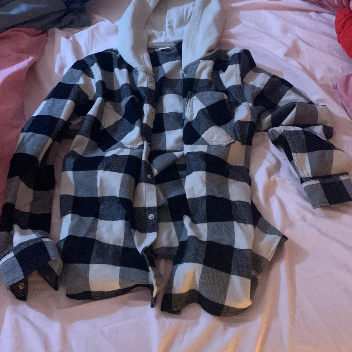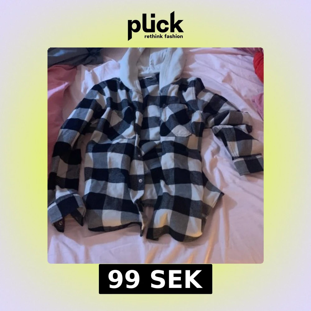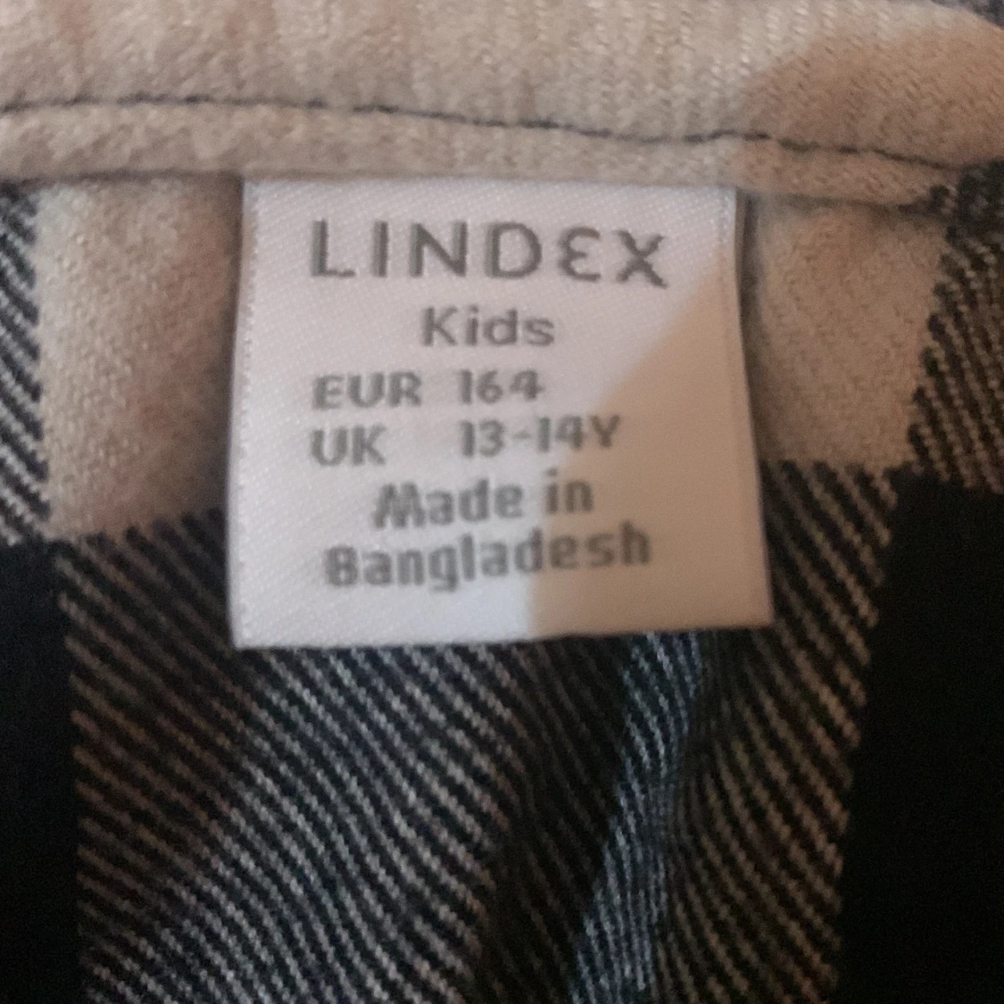 Overshirt från Lindex i storlek 164 med svartvitt rutigt mönster och mjuk grå huva. Skjortan har långa ärmar, två bröstfickor med lock och knappar framtill. Perfekt för lager-på-lager och chill stil. Materialet är bomull, vilket gör den skön att bära.
