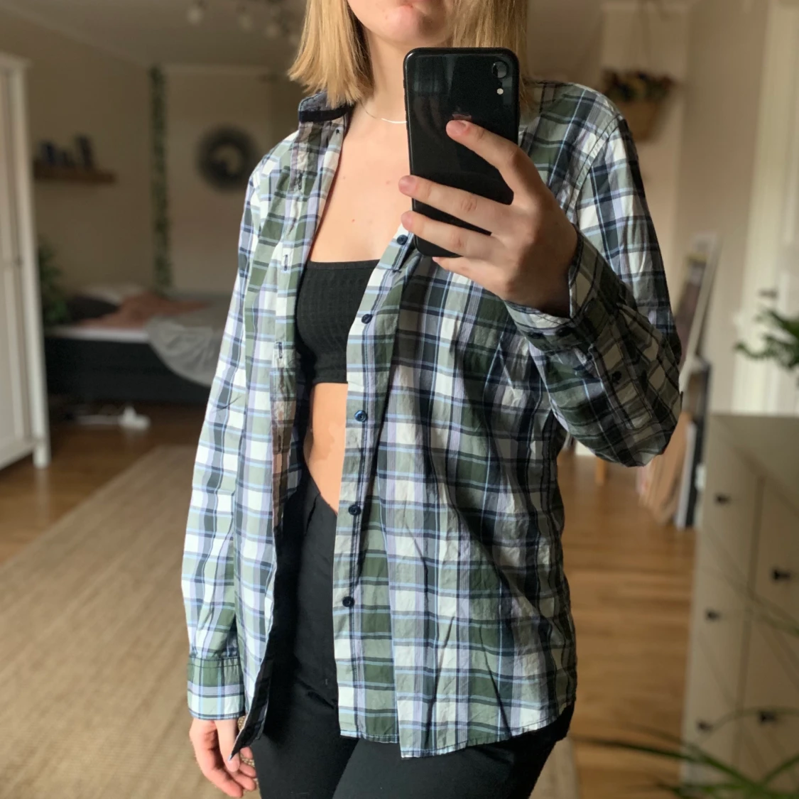 Rutig grön/blå/vit skjorta köpt på second hand. Ganska tunt material o något smalare i ärmarna. Väldigt fint skick. Köparen står för frakt :) hör av dig för mer info/bilder😊