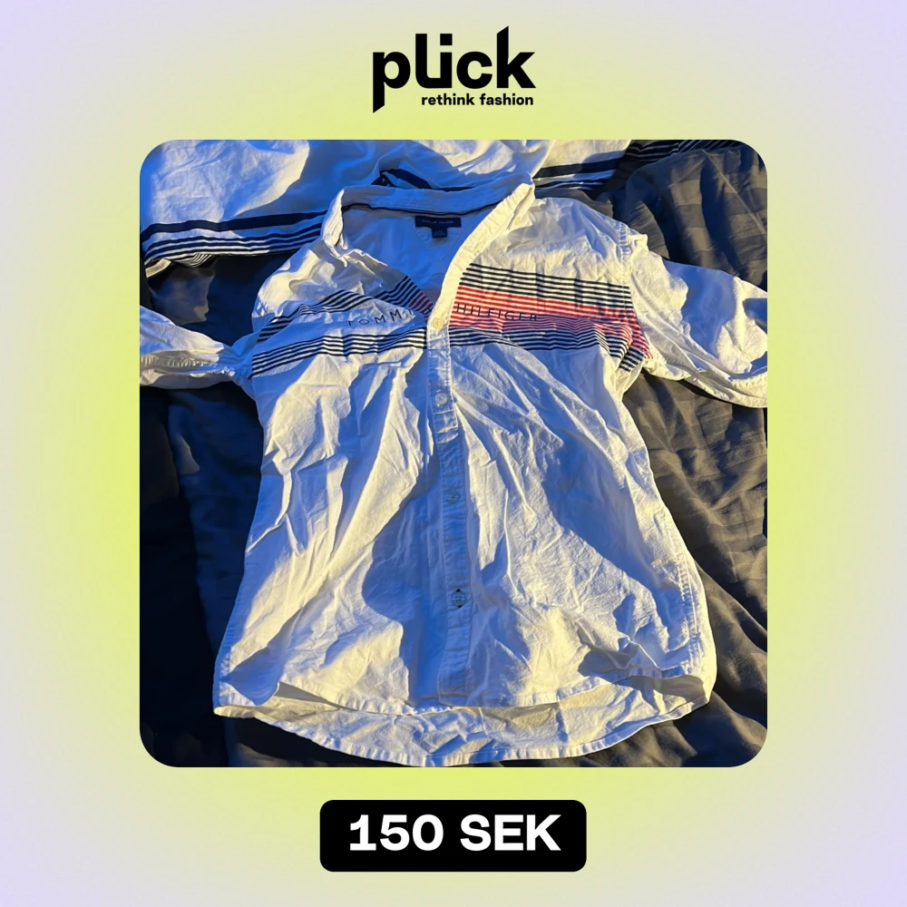 Säljer en snygg vit skjorta från Tommy Hilfiger Skjortan har ett coolt randigt mönster i blått och rött över bröstet och knappar framtill. Perfekt för både vardag och fest! 🕺