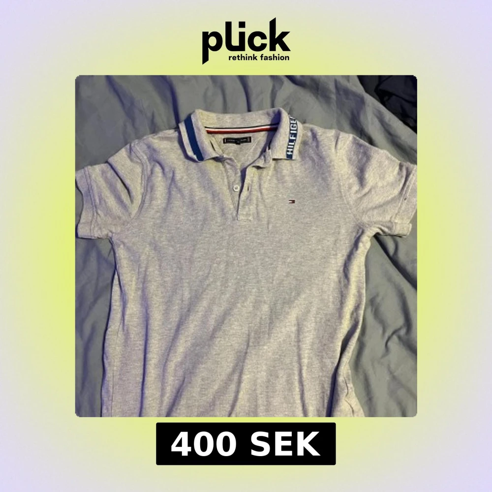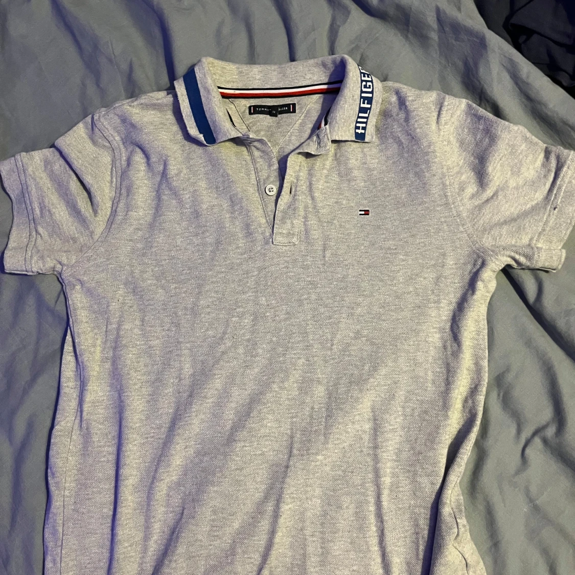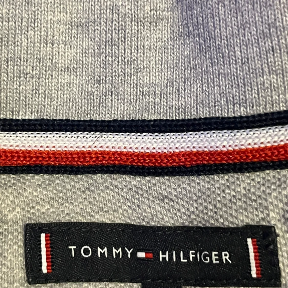 Snygg grå pikétröja från Tommy Hilfiger med klassisk krage och knappar. Kragen har blå och vita detaljer samt texten 'Hilfiger' på sidan. Perfekt för en stilren look.