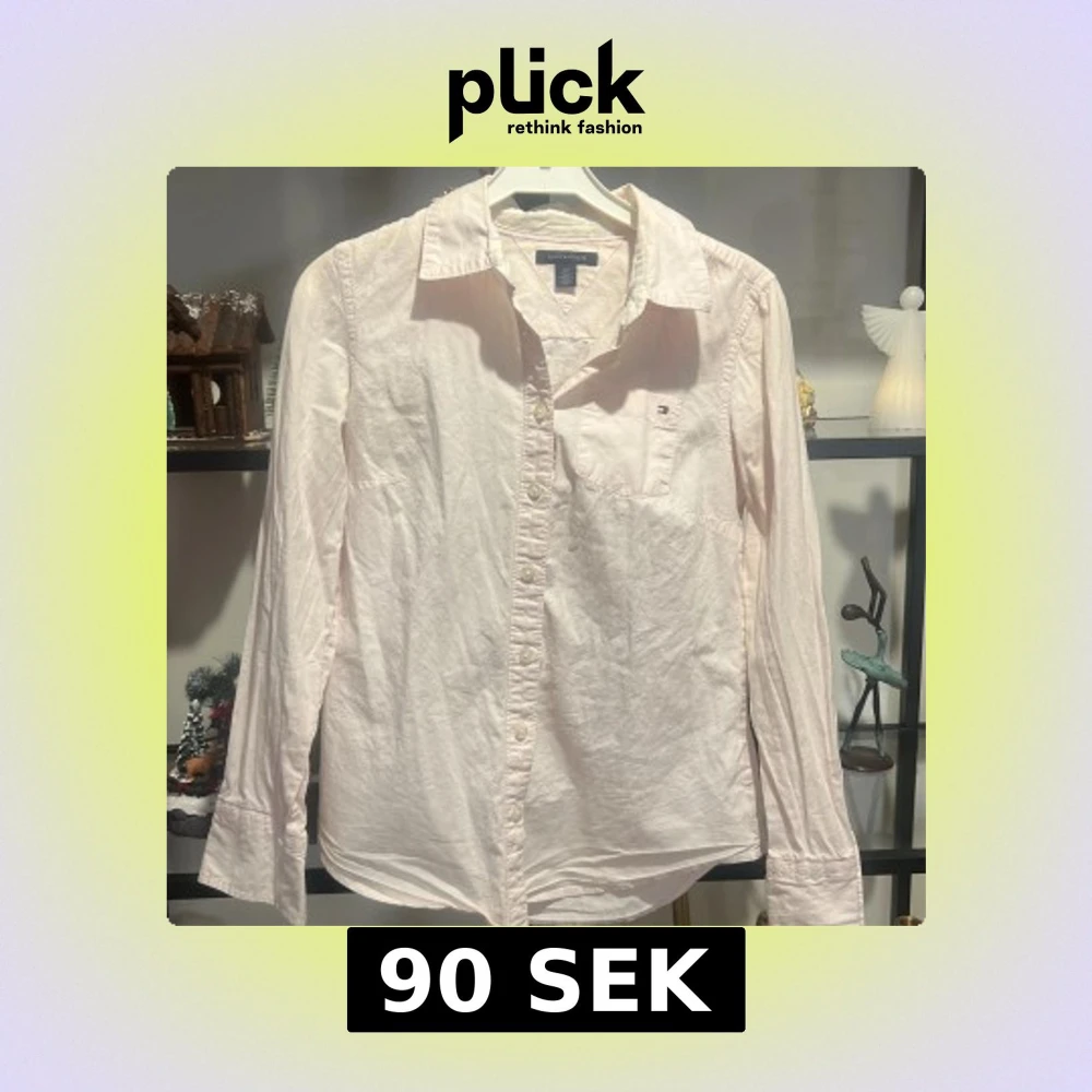 Säljer en stilren ljusrosa skjorta från Tommy Hilfiger. Skjortan har långa ärmar och en klassisk krage. Den är försedd med knappar framtill och har en liten logotyp på bröstfickan. Perfekt för en avslappnad men ändå elegant look.