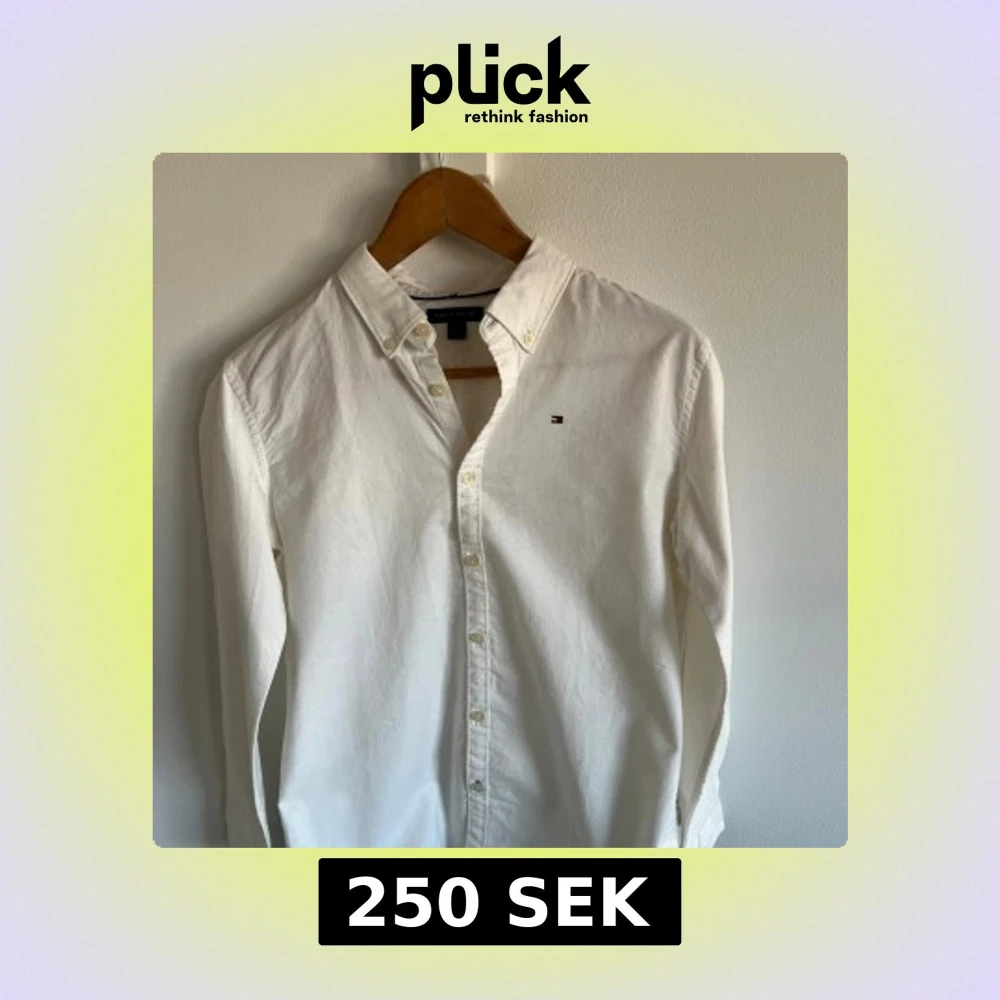 Säljer en klassisk vit skjorta från Tommy Hilfiger med button-down krage och broderad logotyp på bröstet. Skjortan har långa ärmar och knappar framtill. Perfekt för en stilren look.