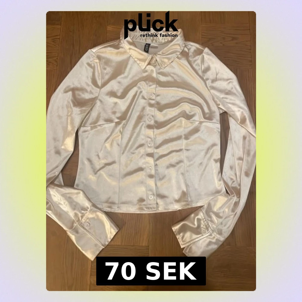 Snygg champagnefärgad blus från H&M Divided i glansigt satinmaterial (polyester blandat). Klassisk krage, långärmad och med knappar framtill. Perfekt för dig som gillar en clean och lyxig vibe. Passformen är normal och materialet känns mjukt mot huden. Aldrig använt. Säljer för att den inte kommit till användning. Pris kan diskuteras.