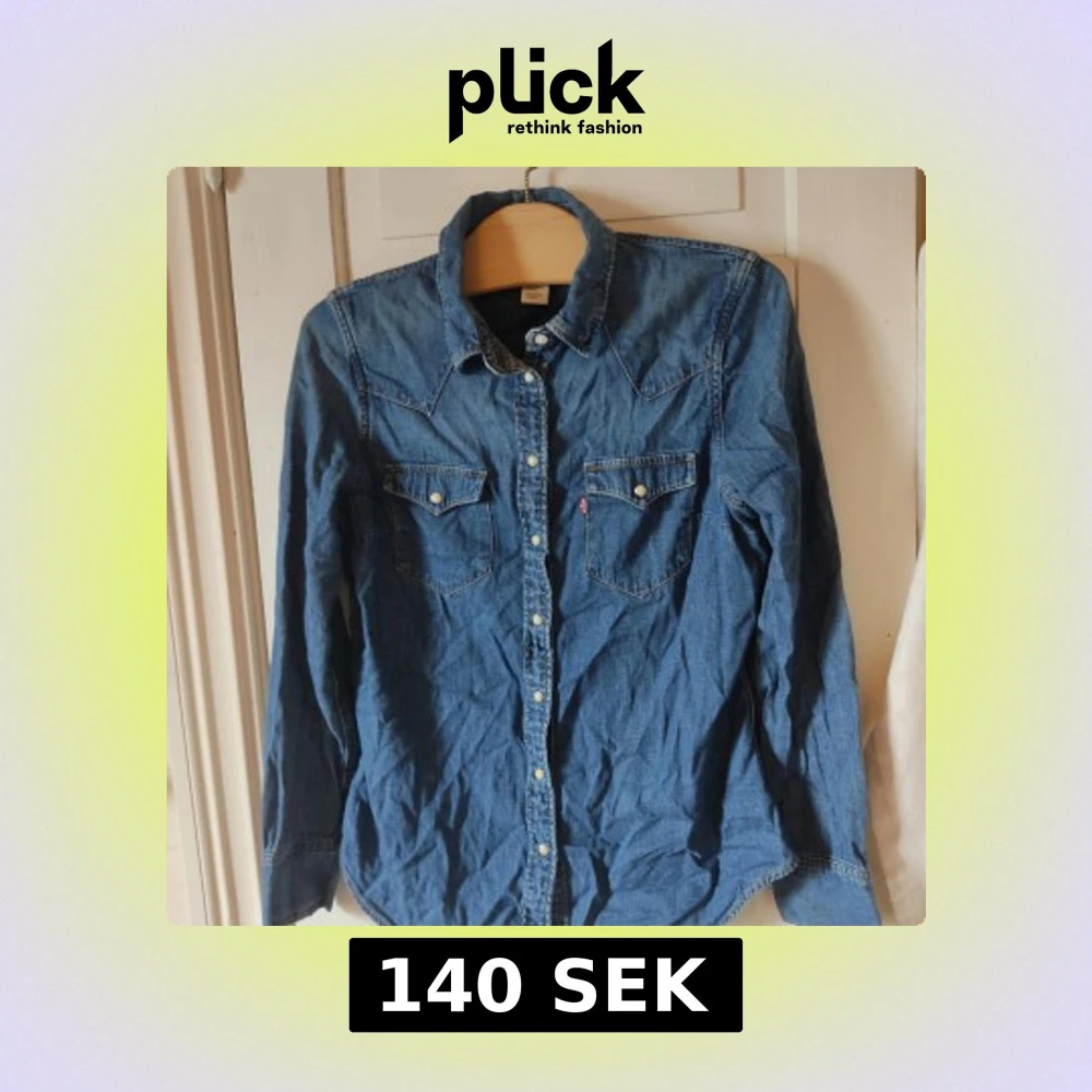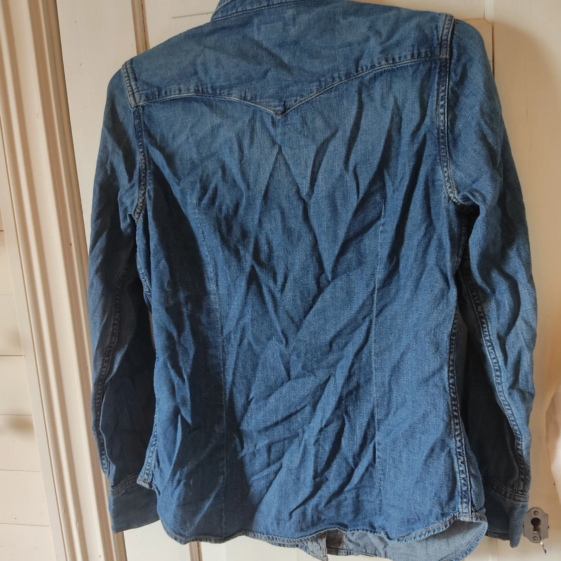 En blå jeansskjorta från Levi's, den har dekorativa knappar med pärl utseende. Bröstfickorna är riktiga. Skjortan är av ett tunnare jeanstyg men känns fortfarande som bra kvalite. Den är skrynklig för att jag inte vikt den ordentligt i garderoben hehe.