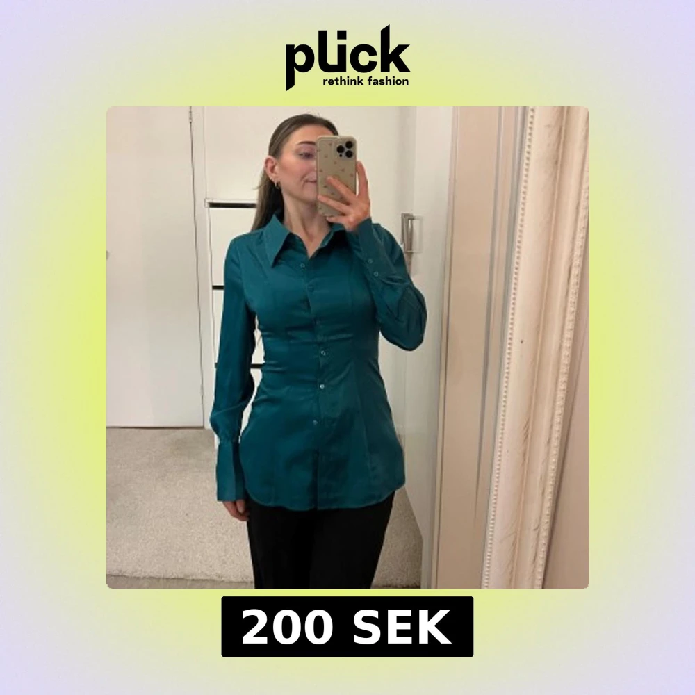 Snygg turkos skjorta från Gina Tricot med figurnära passform, långa ärmar och klassisk krage. Skjortan har knappar hela vägen framtill och är tillverkad i ett glansigt satin material som ger en lyxig känsla. Perfekt för jul och nyår. Helt ny oanvänd, endast tvättad.