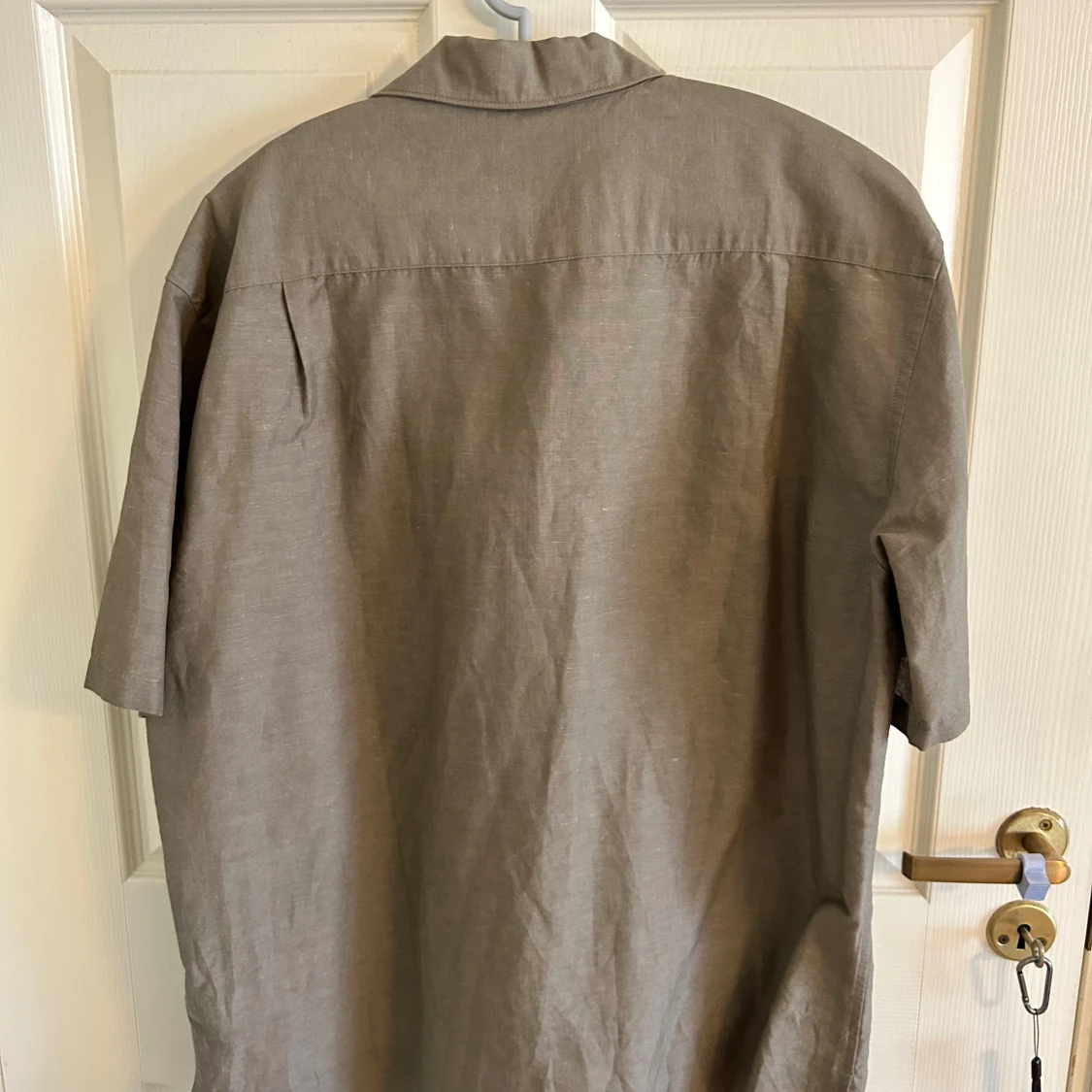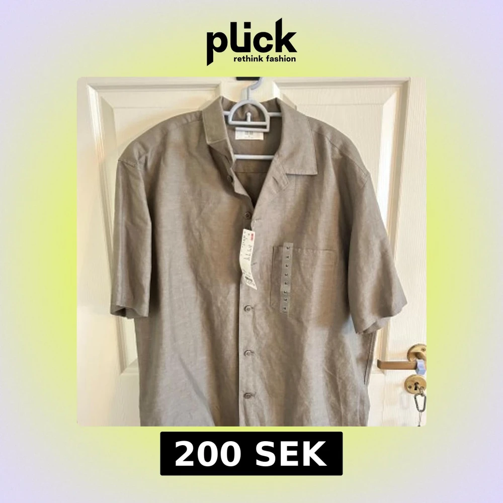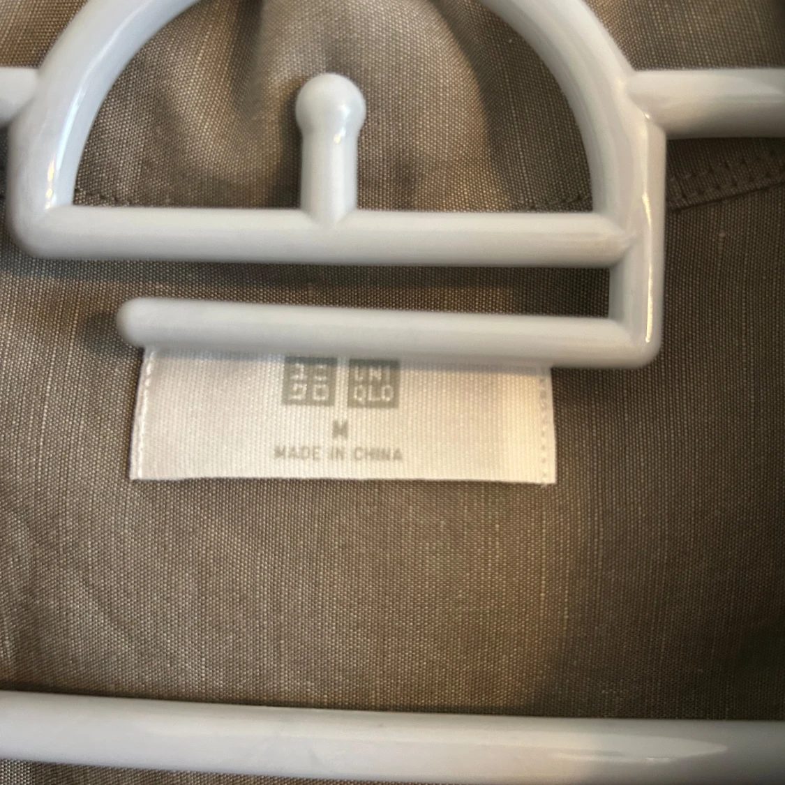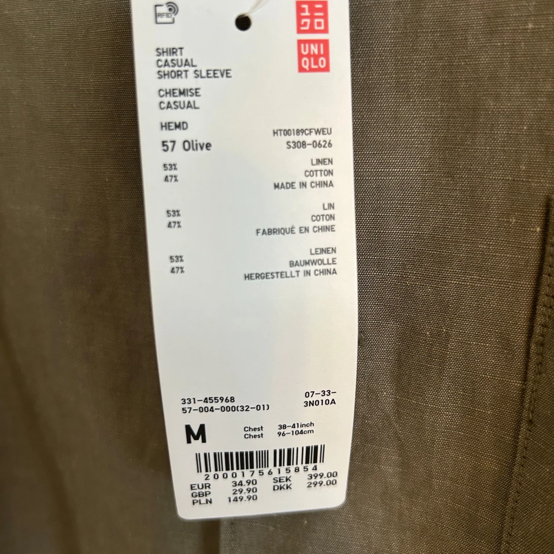 Snygg olivgrön skjorta från Uniqlo i storlek M. Skjortan har korta ärmar, klassisk krage, bröstficka och knäppning framtill. Tillverkad i en skön mix av linne och bomull som ger en luftig känsla. Perfekt för varma dagar. Köptes för 399kr