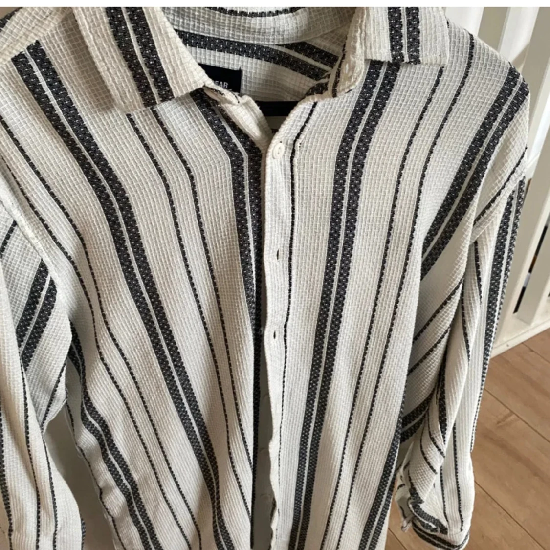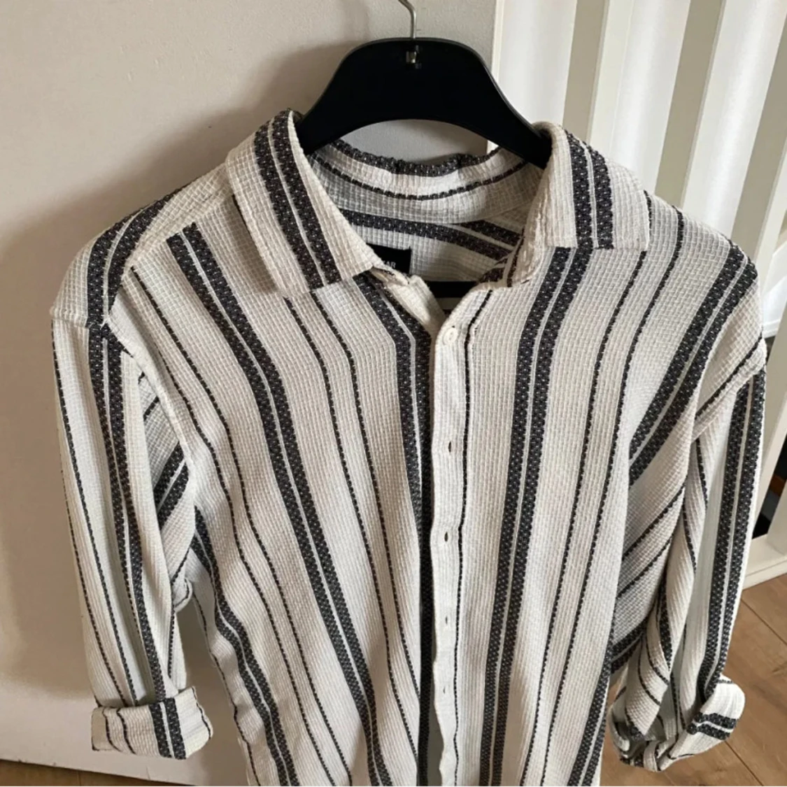 Säljer en snygg randig skjorta/overshirt från Pull&Bear i storlek M. Skjortan har ett stilrent mönster i svart och vitt med knappar framtill. Perfekt för både vardag och fest! 🖤🤍Hör av er vid frågor eller om du vill ha fler bilder. 👊