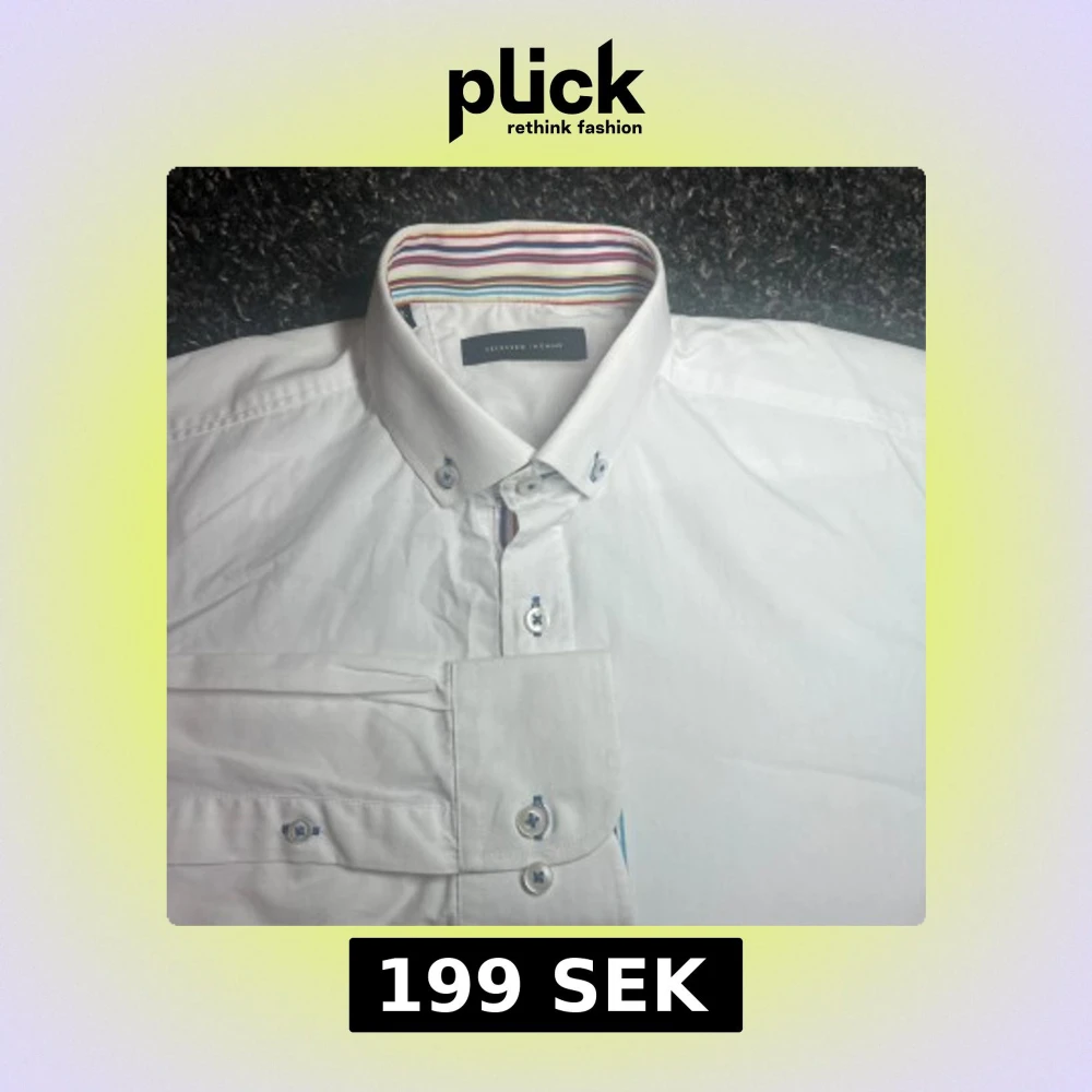 Snygg vit skjorta från Selected Homme med ränder på insidan av kragen. Skjortan har långa ärmar och knappar framtill. Perfekt för en stilren look. Passar påse fest och vardag! Conditon 9,5/10. Hör av dig vid minsta lilla fråga!🤩