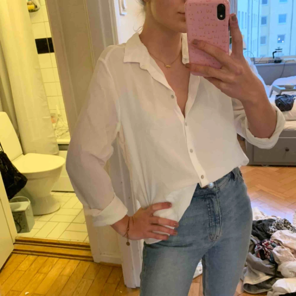 Vit skjorta i mjukt bomullsmaterial med knäppning i pärlemor. Sitter oversize på mig som vanligtvis är en 34a. Priset är exklusive frakt.