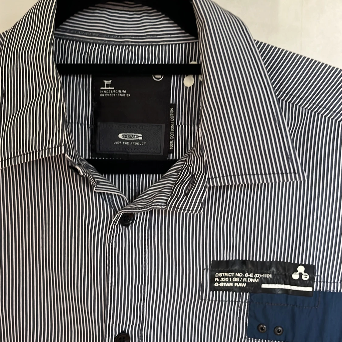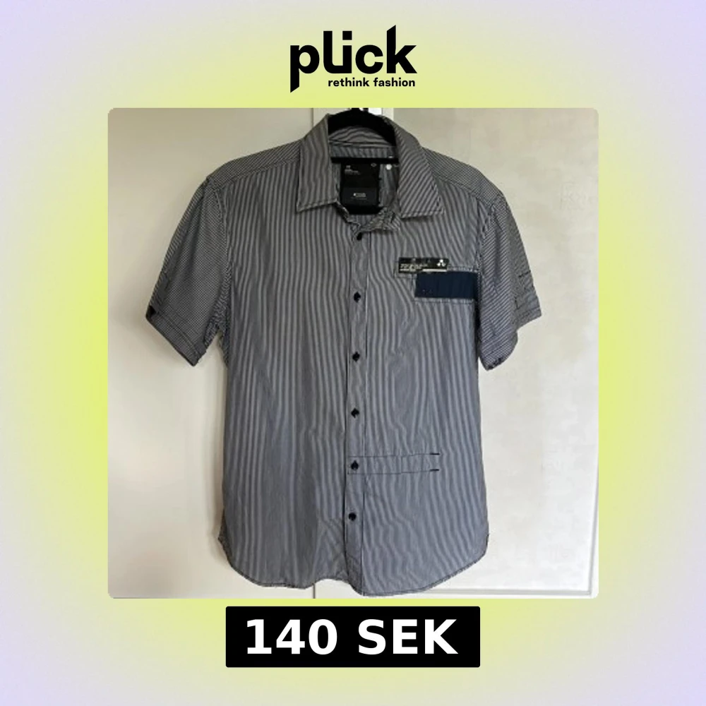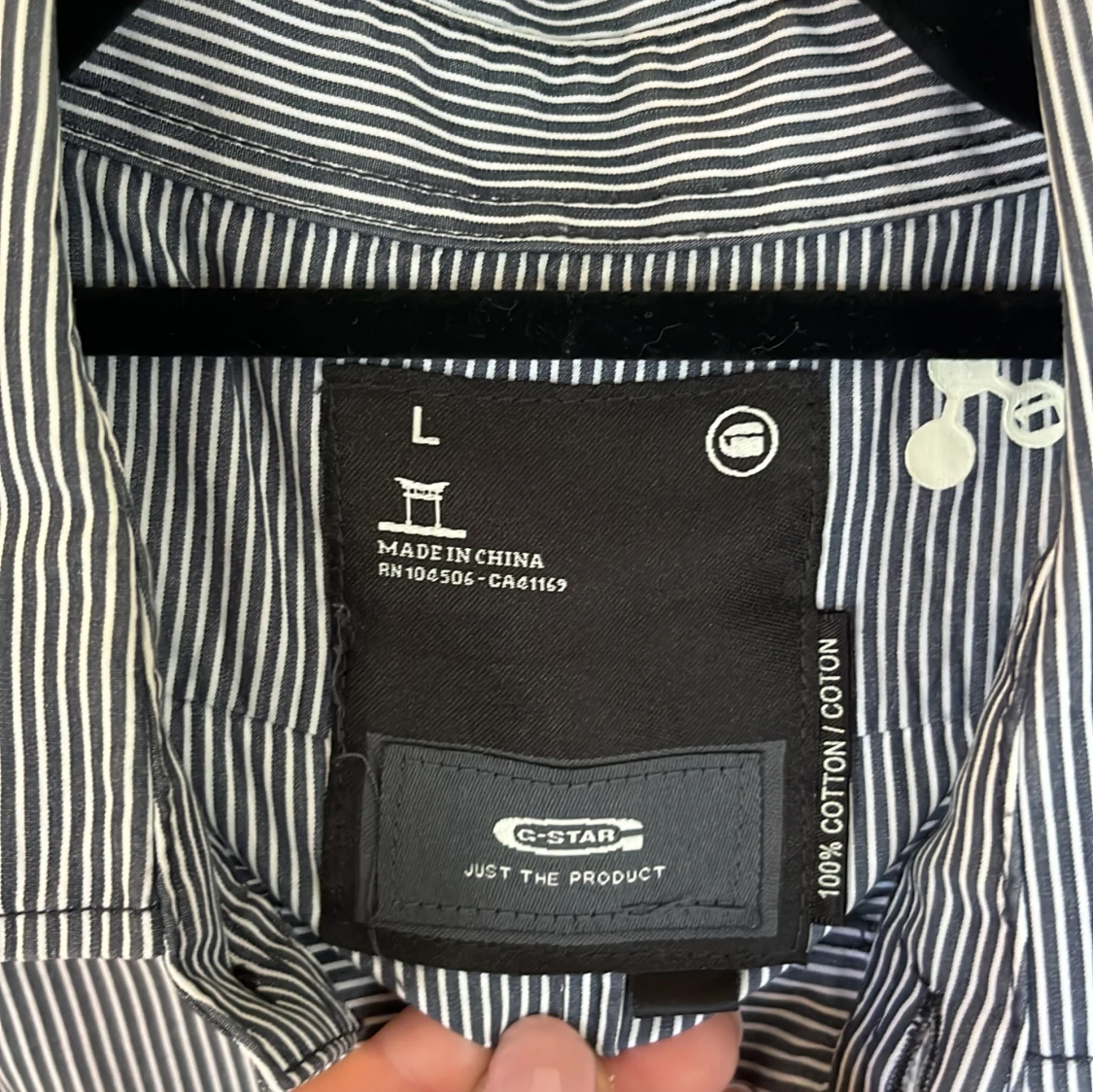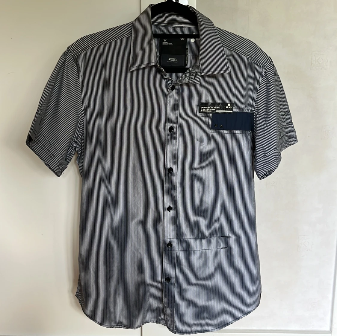 Säljer en snygg kortärmad skjorta från G-Star i svartvitt randigt mönster. Skjortan har knappar framtill och en bröstficka med detalj. Tillverkad i 100% bomull, perfekt för varmare dagar.