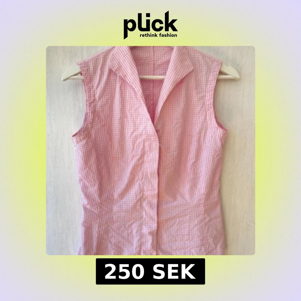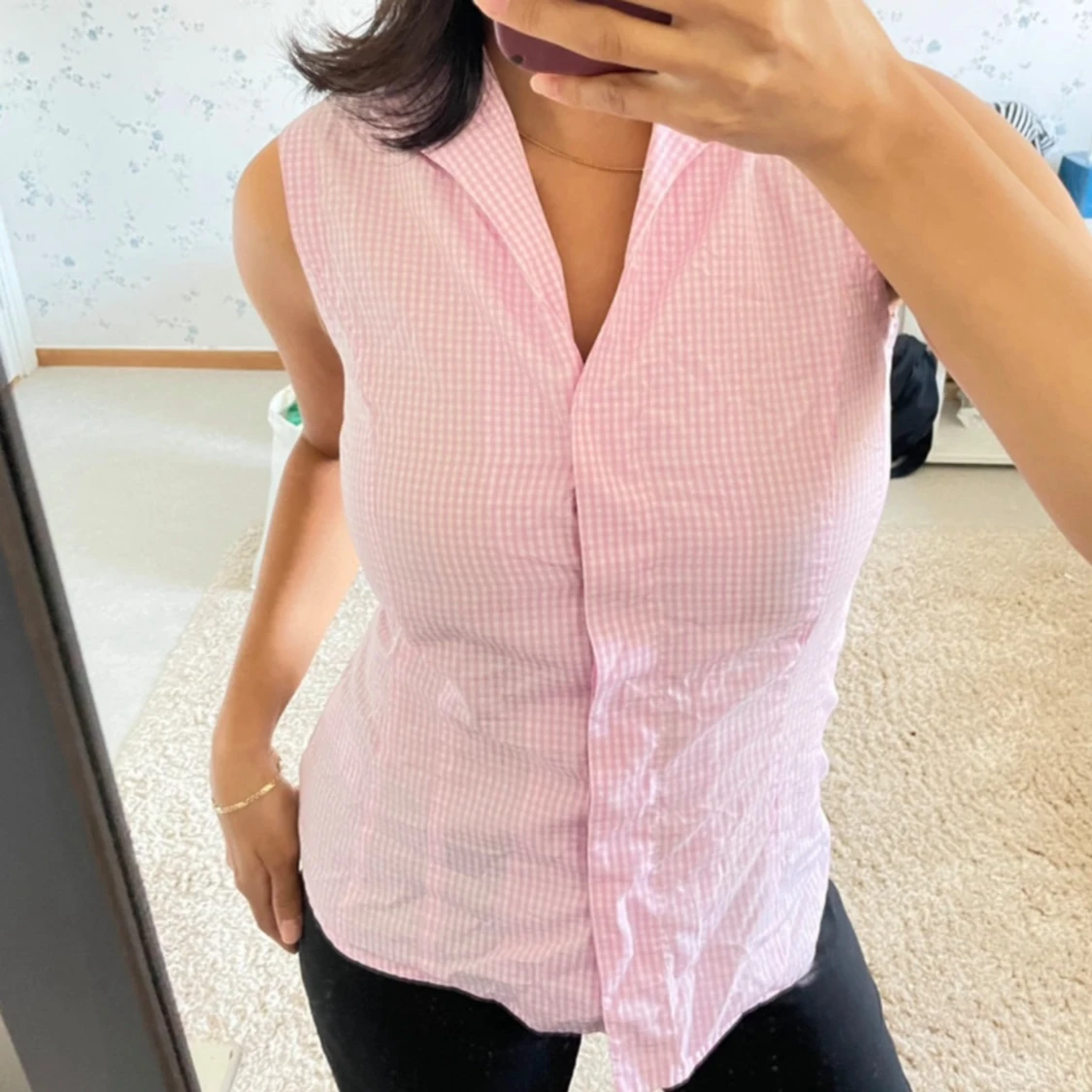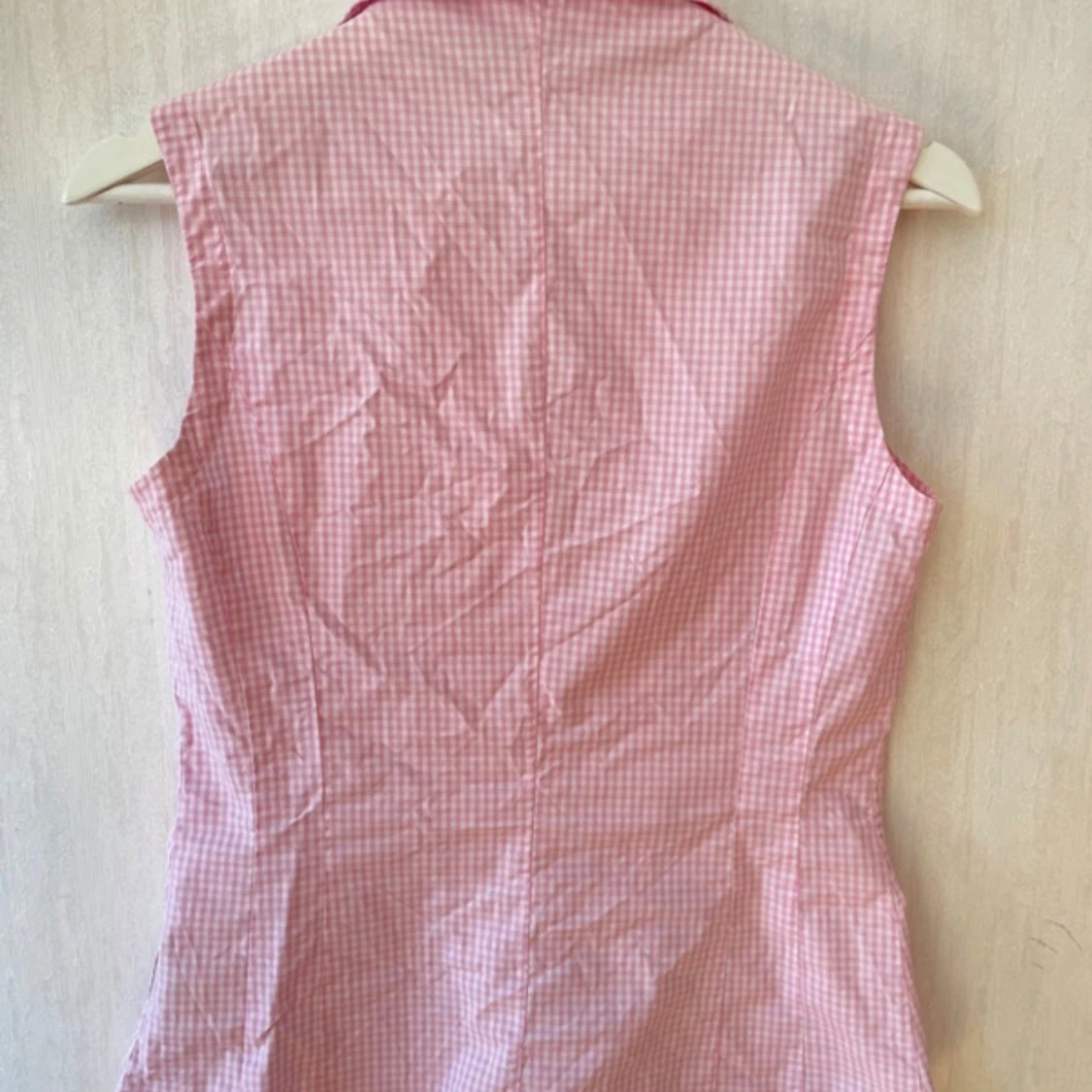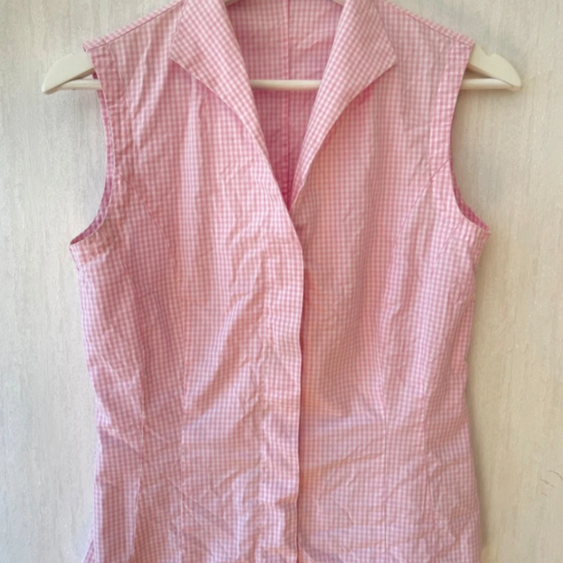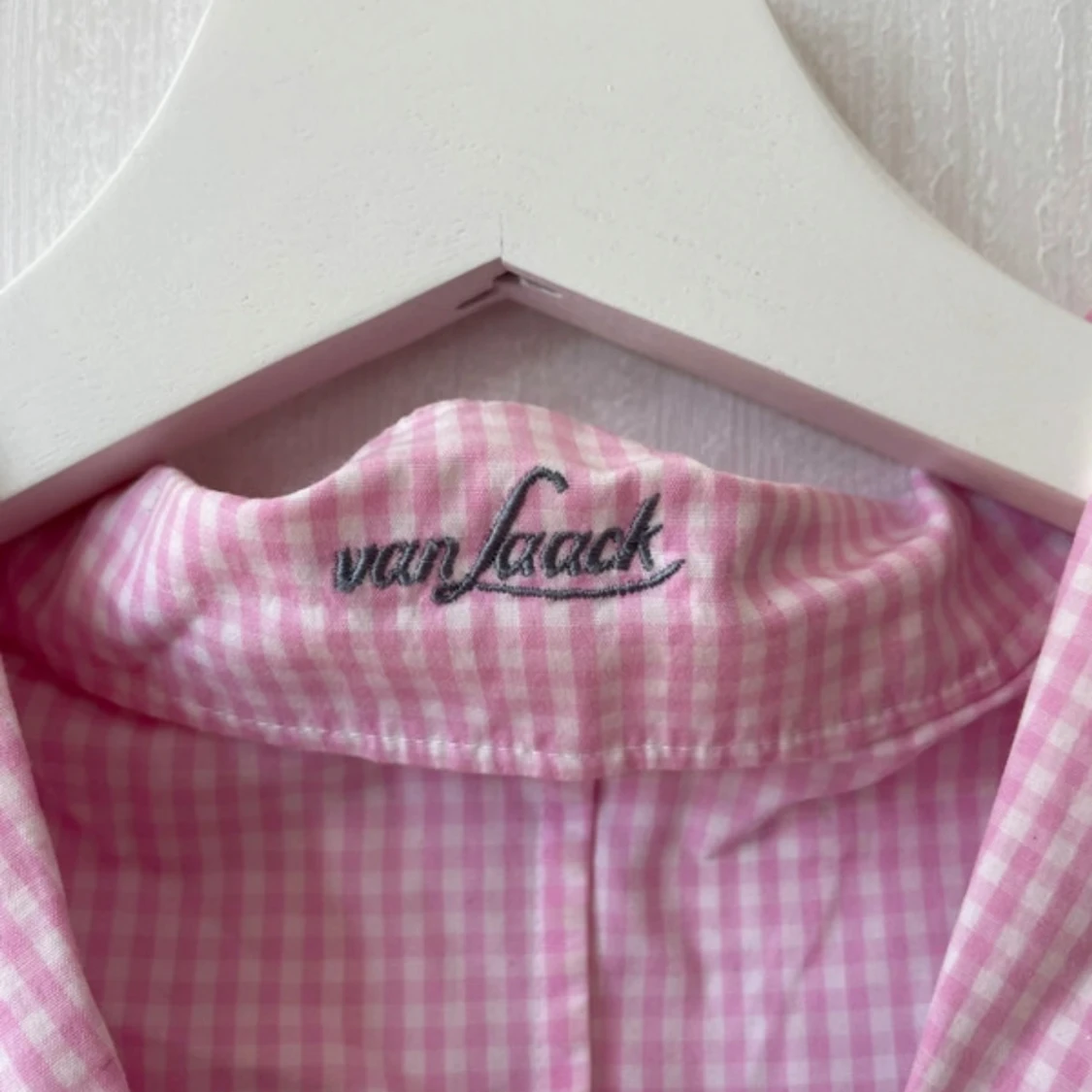 En vintage rosa/vit rutig väst med v-ringning och knappar. Från tyska märket van Laack i storlek XS. Skjortan har ett smått rutigt mönster i vitt och rosa och är figurnära i modellen🌷