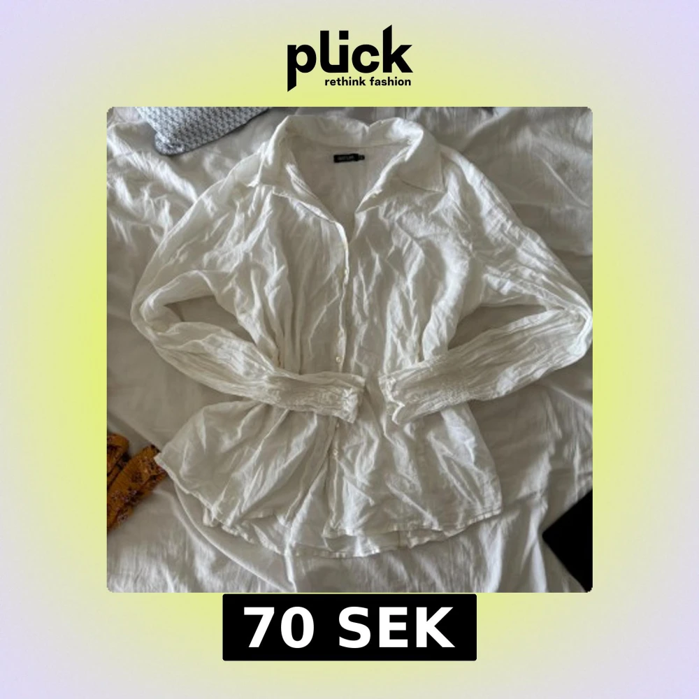 Drömmig vit skjortblus i tunn bomull med linnekänsla från Sisters Point. Smockade ärmslut, klassisk krage, knappar fram och lätt transparent. Den perfekta sommarblusen – avslappnad, luftig och stilren 💫 Funkar lika bra till jeans som till kjol! 📏 Storlek 44 (passar M/L) 🧼 Mycket fint skick 📬 Skickas snabbt