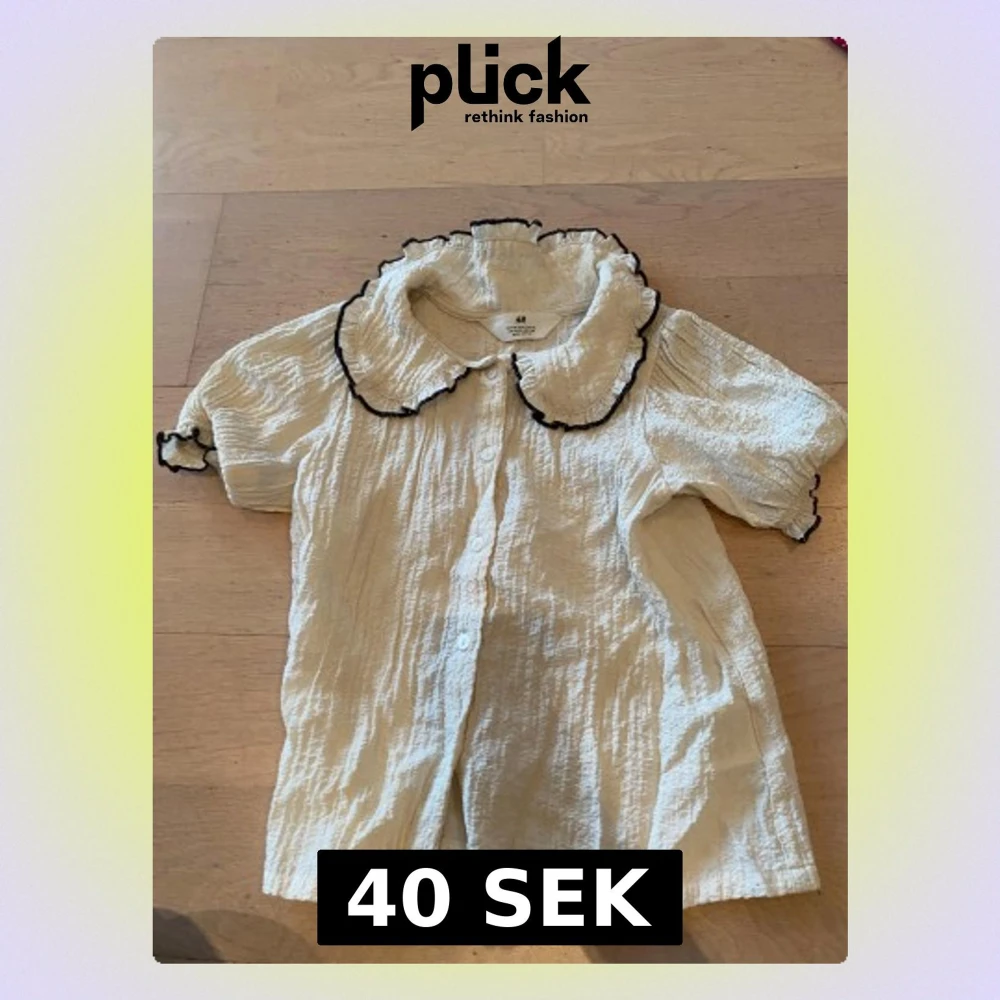 Supersöt vit blus från H&M i storlek 116. Den har korta puffärmar, volangkrage med svart kant och knappar framtill. Materialet är krinklat och känns luftigt och lätt. Perfekt för dig som gillar romantiska detaljer och en lekfull stil.