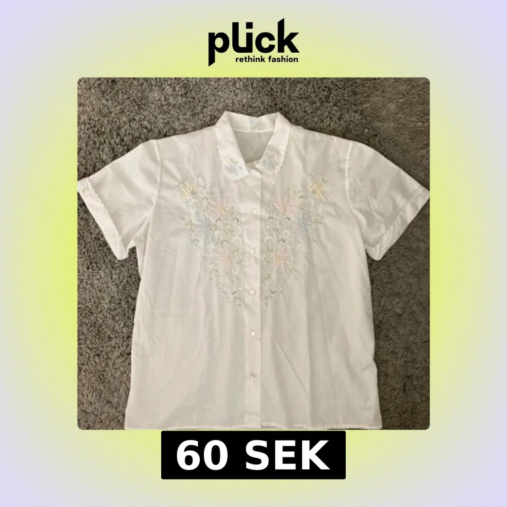 Vit loose fit kortärmad skjorta/blus med pastellfägad brodyr från 80-talet. Toppen är inköpt på Beyond retro och är i gott skick. Passar strl XS-M beroende på hur tight man vill att den sitter. Klicka gärna pả köp nu och meddela för eventuella frågor. :)