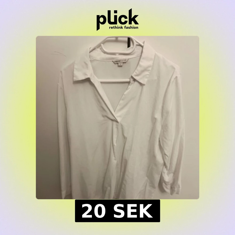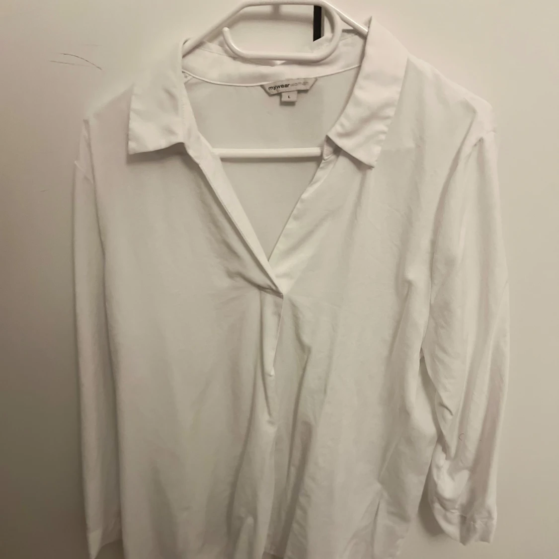 Elegant vit blus med en klassisk krage och v-ringning. Blusen har trekvartsärmar och är tillverkad i ett mjukt material som ger en stilren look. Perfekt för en chic och minimalistisk stil.