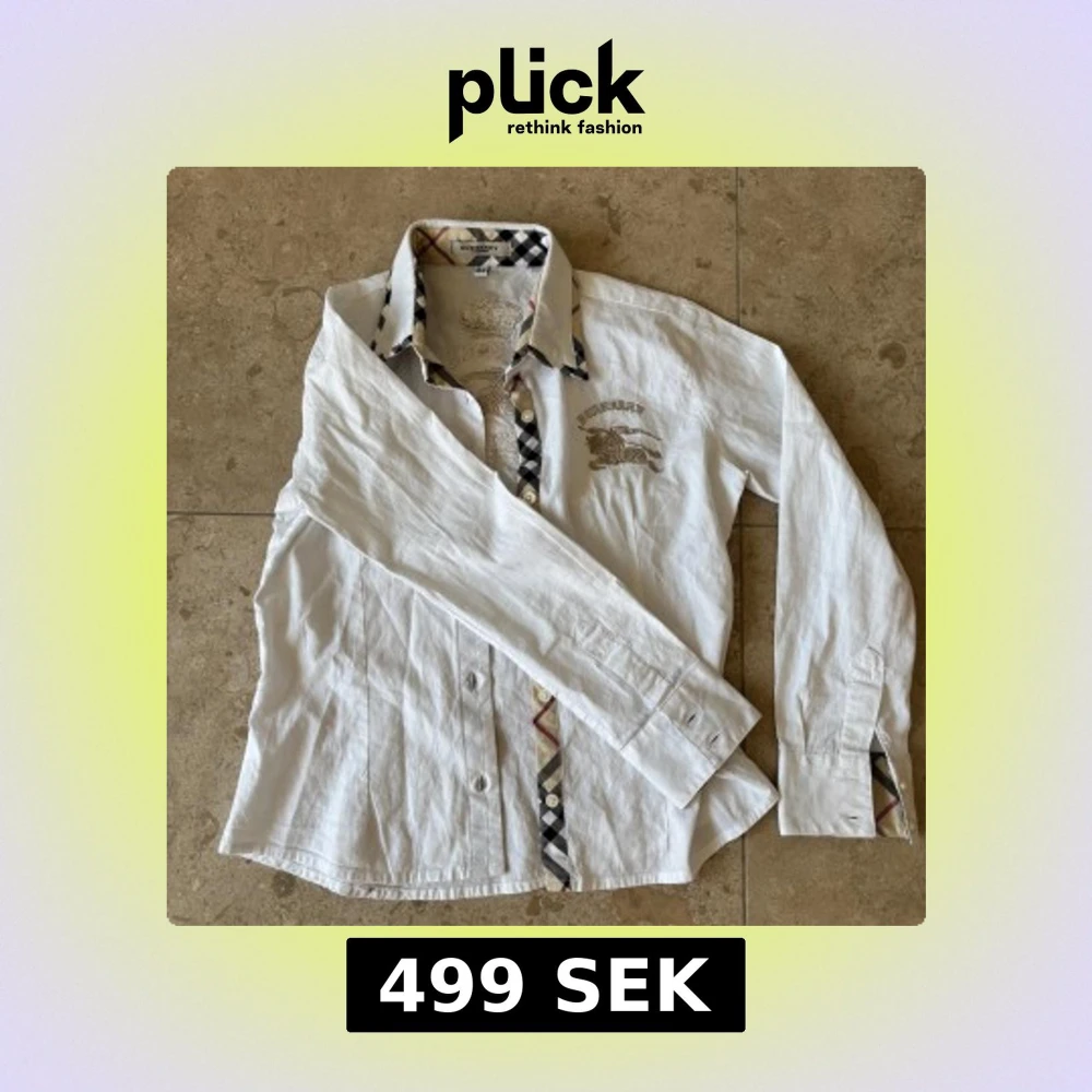 Vit skjorta från Burberry med klassiskt rutigt mönster på insidan av kragen och knappslån. Snygg broderad logga med krona och ryttare på bröstet och ryggen. Långärmad modell i bomull med knappar framtill. Perfekt för dig som gillar stilrena och exklusiva detaljer. Stl 140-146 (true to size) ÄKTA!!!