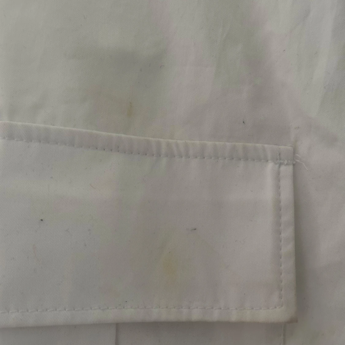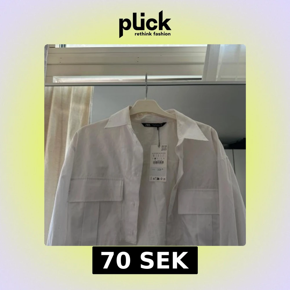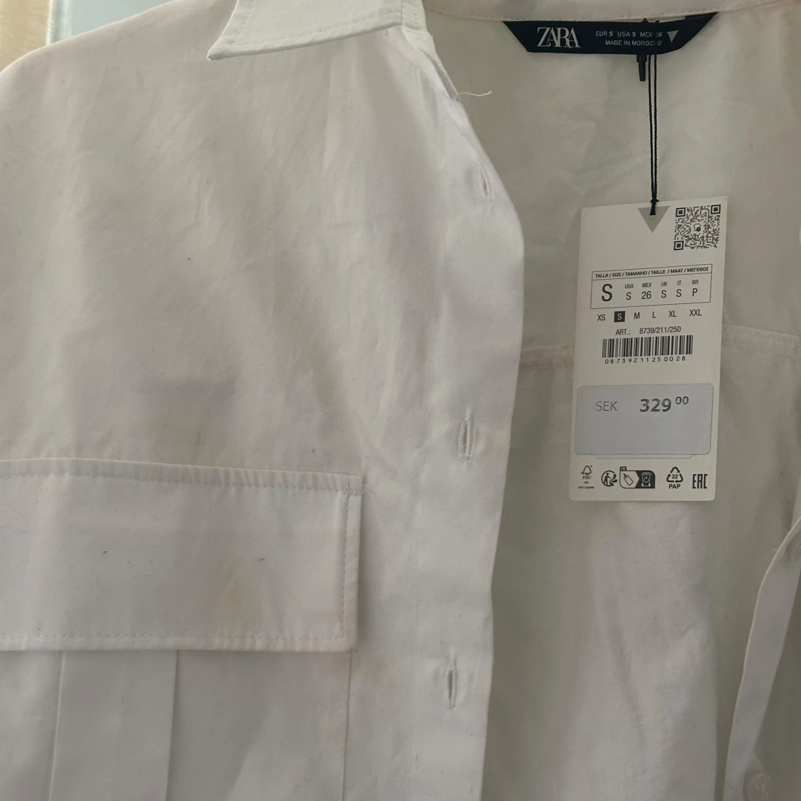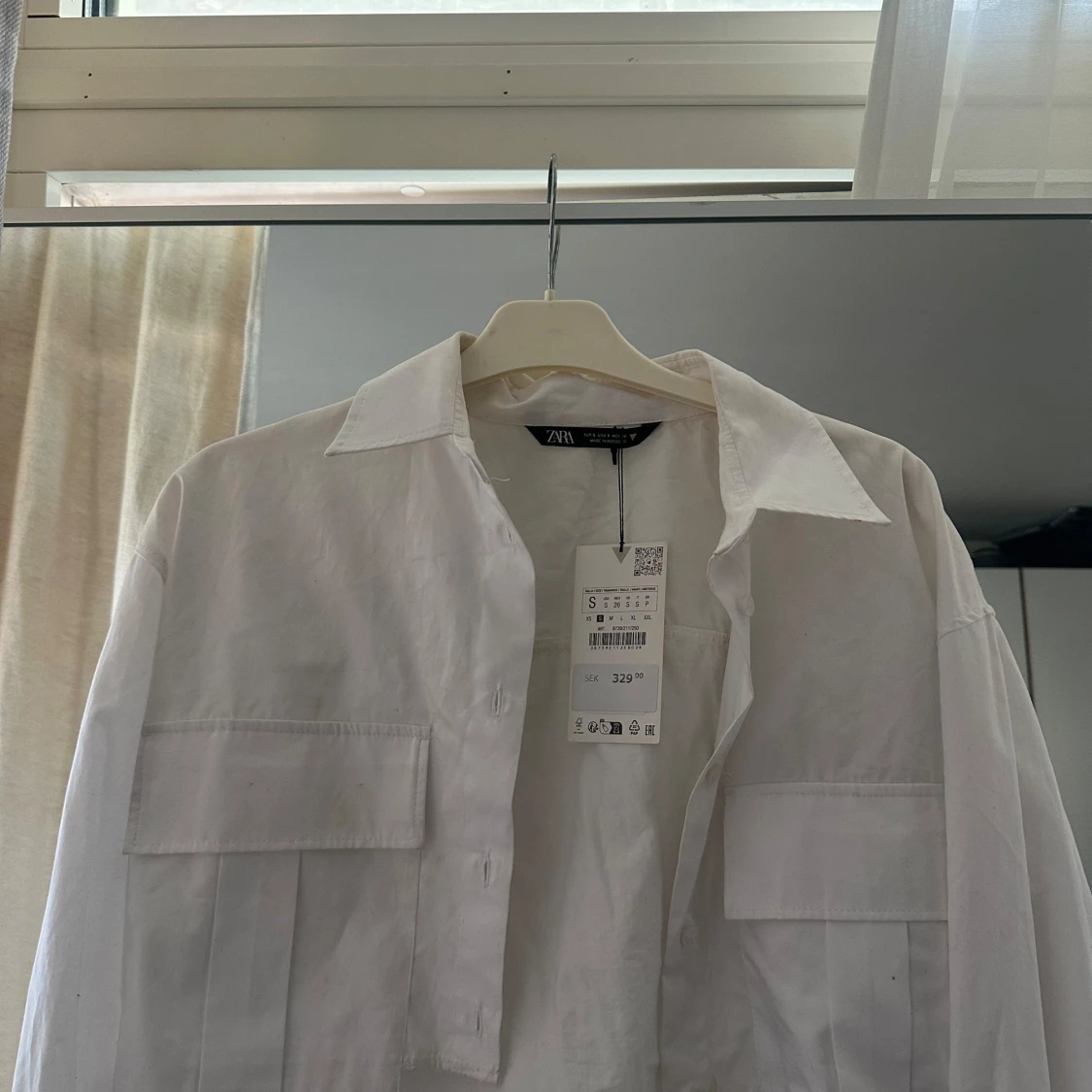 Vit overshirt från Zara i bomull med klassisk krage och stora bröstfickor. Skjortan har en rak passform och knäppning framtill. Gul missfärgning som bör gå bort med en ordentlig tvätt. Prislapp kvar